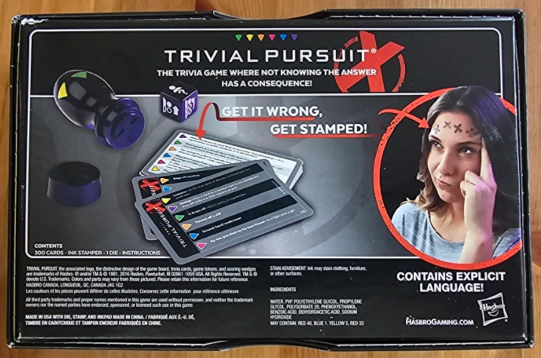 Board game for adults with an ink stamper. 4+ players. 300 cards. Contains explicit language.