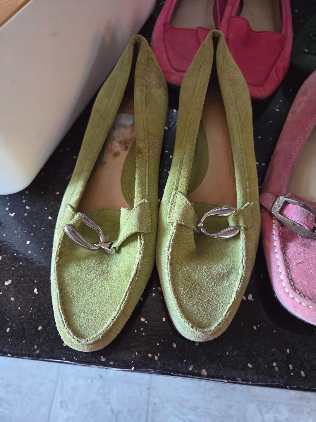 These are lime green suede loafers with silver hardware. The material is suede and they have a slip-on design. They'd be a fun pop of colour for any outfit!