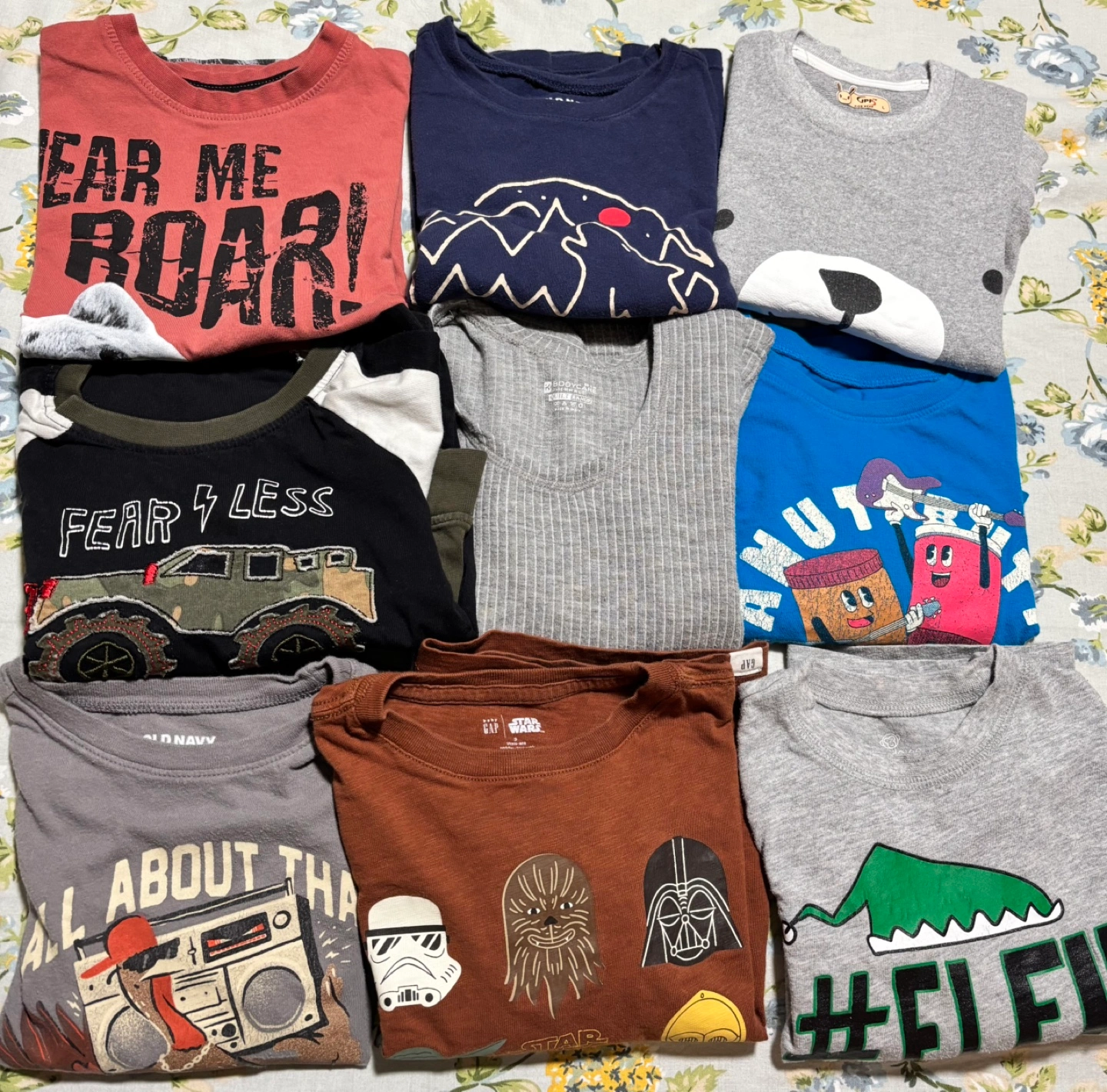 Bundle includes 9 boys' graphic t-shirts. Various colours and designs. Sizes range from 4T to 5T. Pre-owned, good condition.