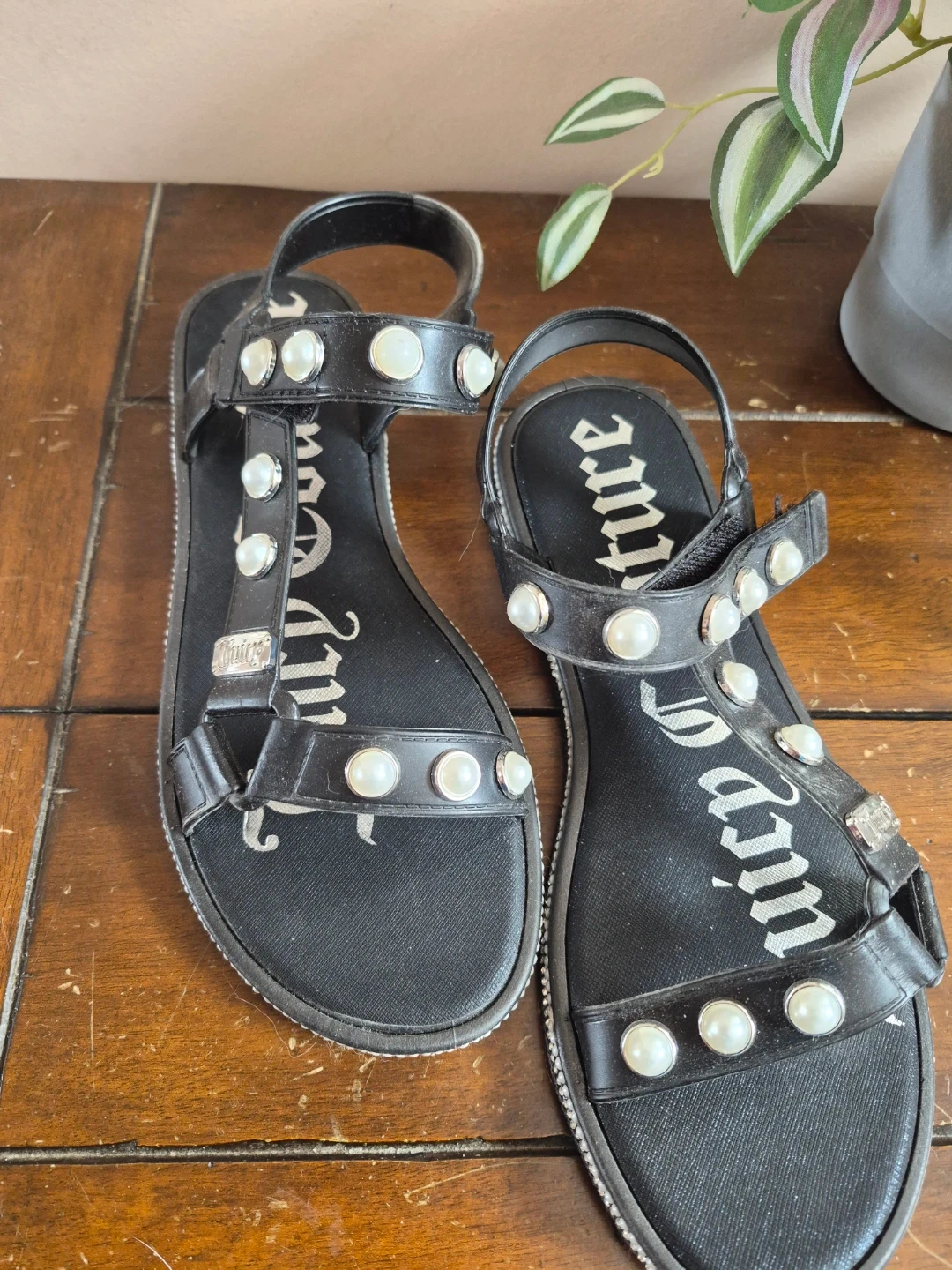 Black Juicy Couture sandals adorned with faux pearls and rhinestones. Featuring the brand's gothic-style logo across the footbed. These flat sandals are made from man-made materials.