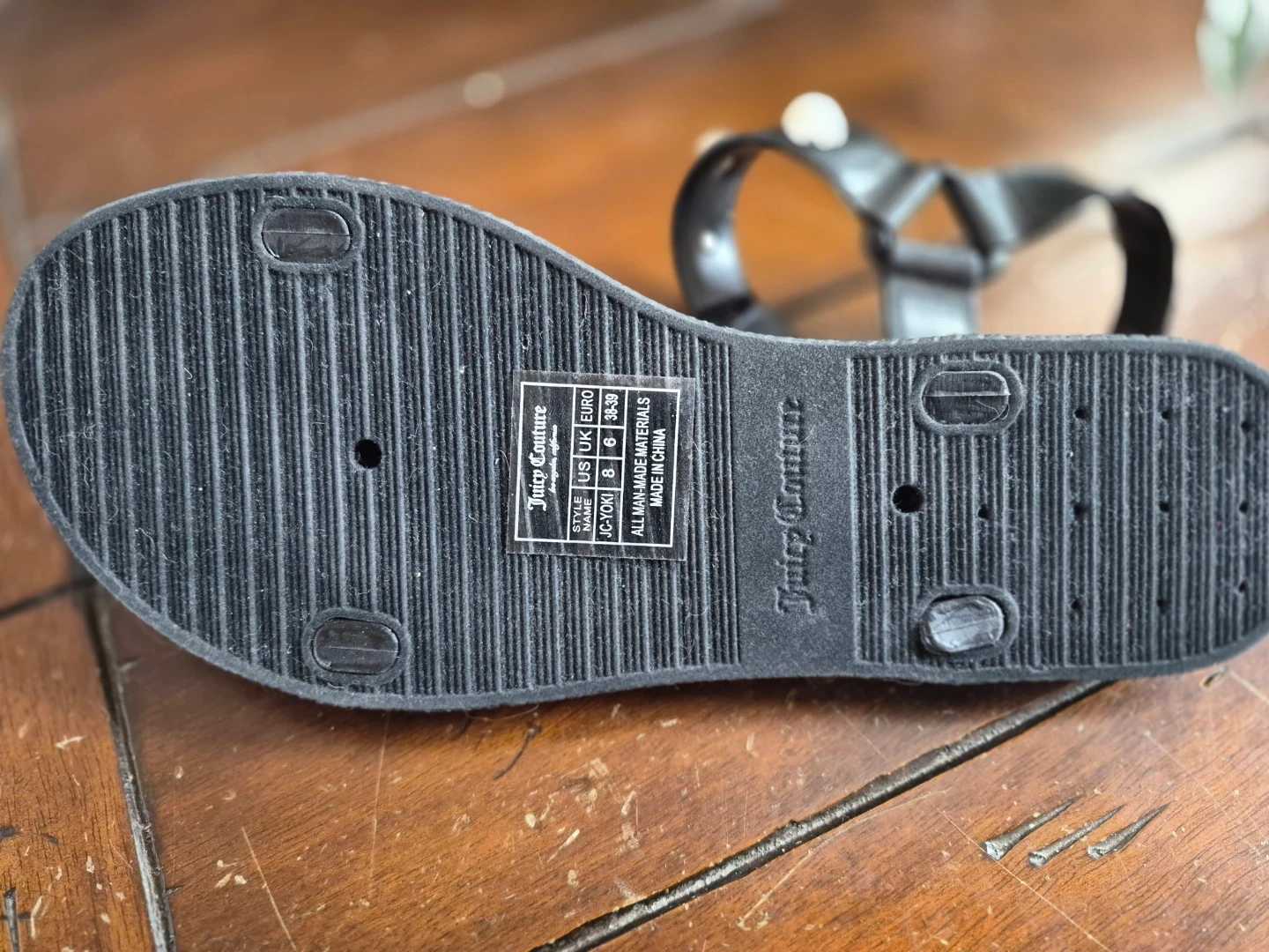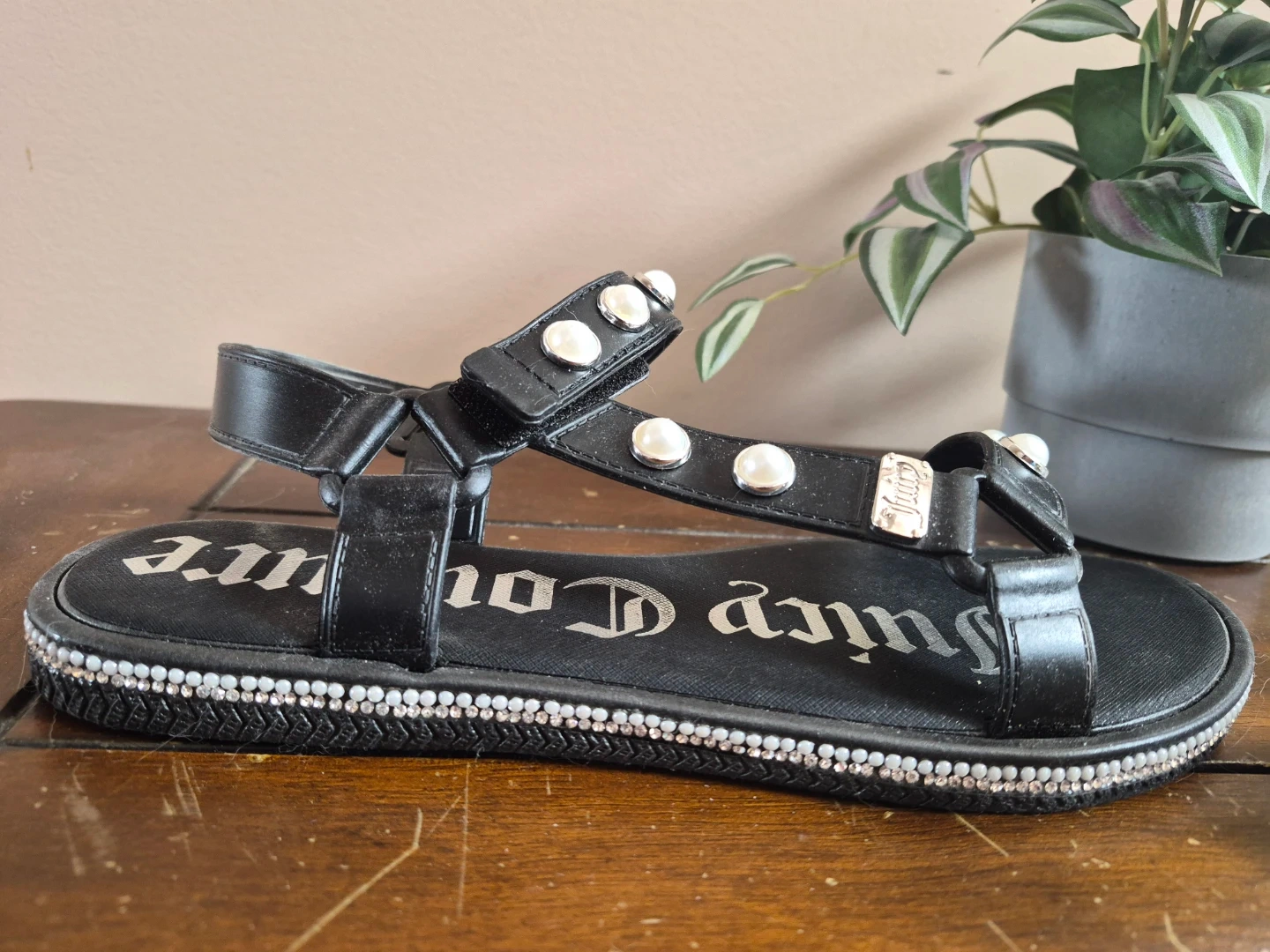 Black Juicy Couture sandals adorned with faux pearls and rhinestones. Featuring the brand's gothic-style logo across the footbed. These flat sandals are made from man-made materials.