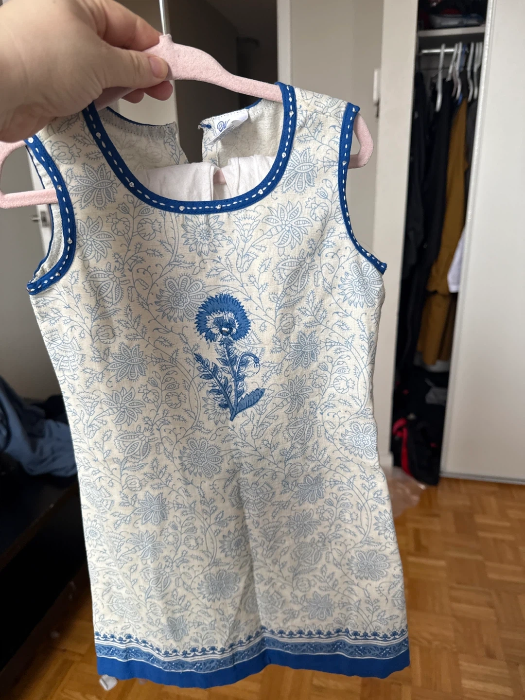 This cute sleeveless dress features a charming blue and white floral print with a blue trim. It's paired with coordinating white pants. Perfect for warm weather adventures!