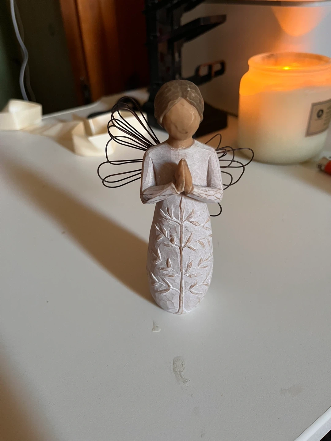 This Willow Tree angel figurine is carved from resin. It's a light cream colour with delicate floral carvings on the dress. The angel has wire wings and is posed with hands together. This piece adds a touch of serenity to any space.