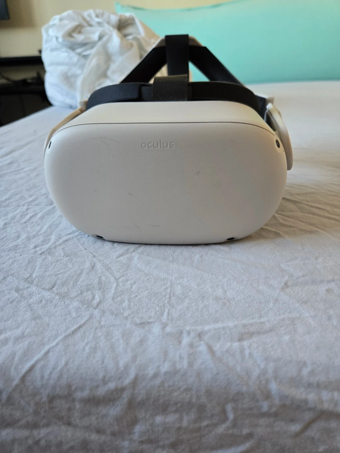 This is an Oculus Quest 2 virtual reality headset. It's a white headset with adjustable straps. It's great for immersive gaming experiences!