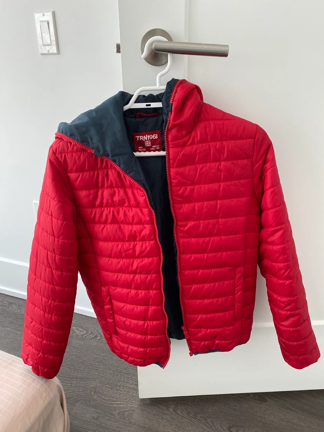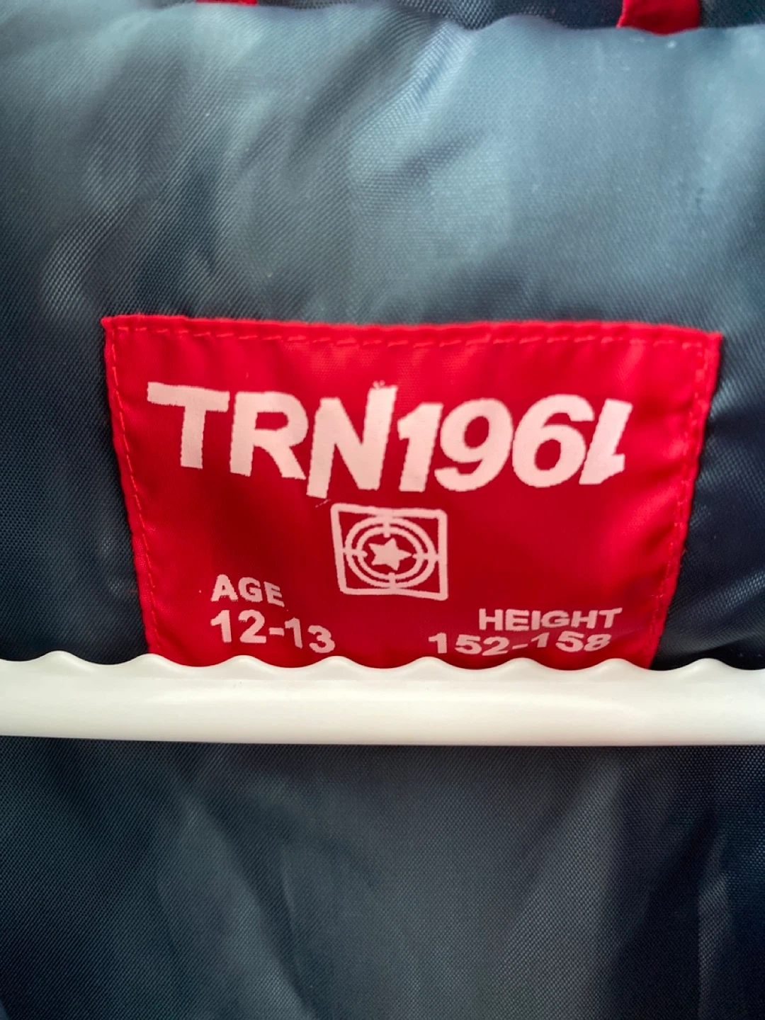 Selling a TRN196L puffer jacket in red! It's designed for kids aged 12-13 with a height of 152-158 cm. Perfect for keeping your little one warm and stylish during the colder months