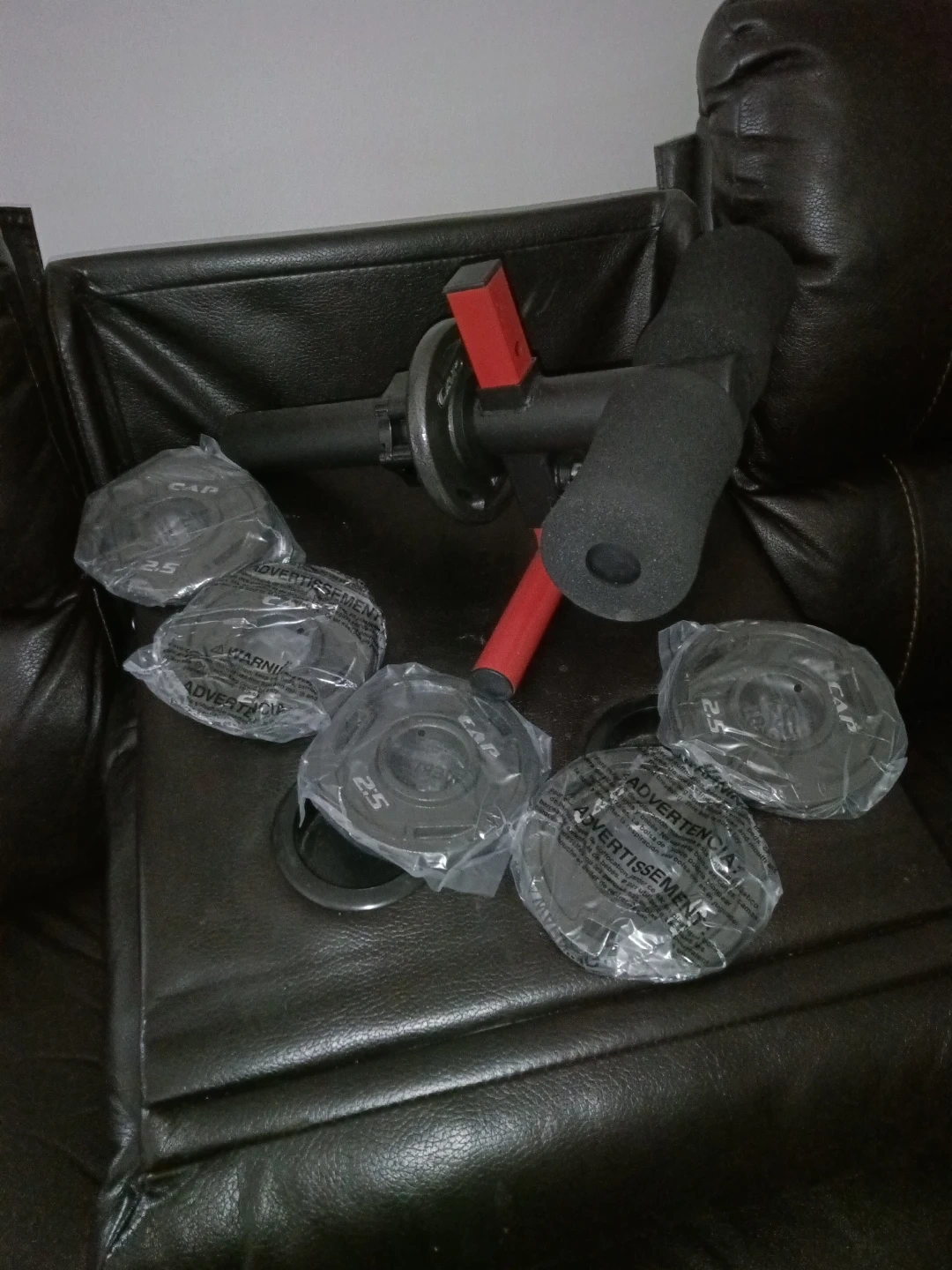 This TIB Barbell home gym system comes with five 2.5lb weight plates, totalling 12.5lbs. It's designed for a compact home workout. The unit has padded grips for comfort.