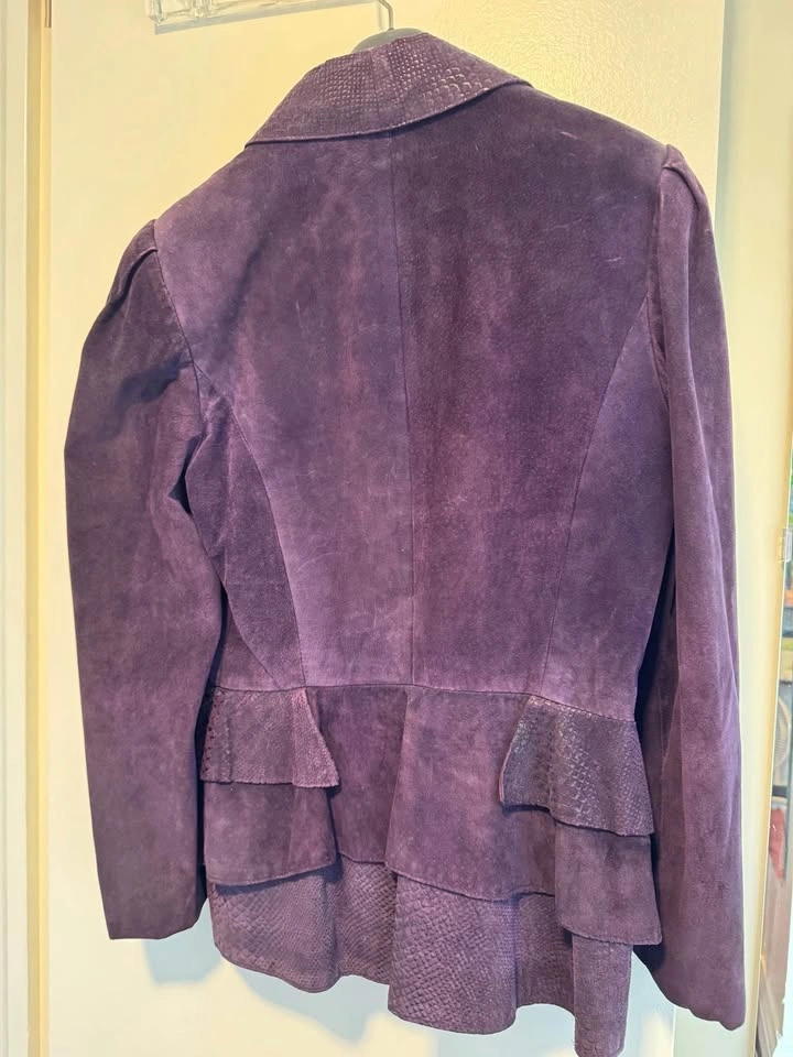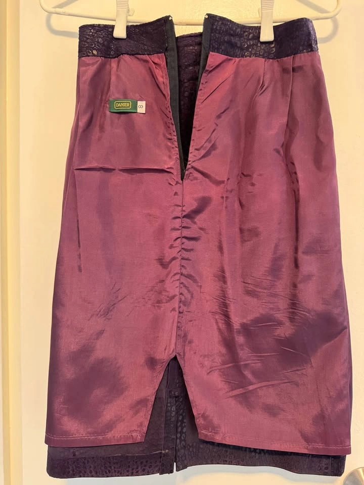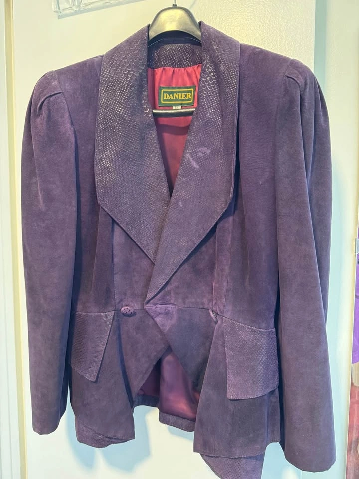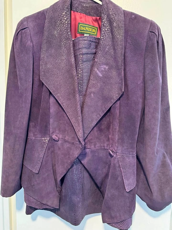 Excellent condition Danier Leather late 80s vintage suede jacket and skirt (snakeskin print) size 8 worn only a few times and stored. Deep Purple colour with lined jacket and skirt.