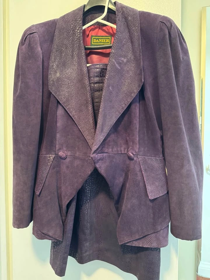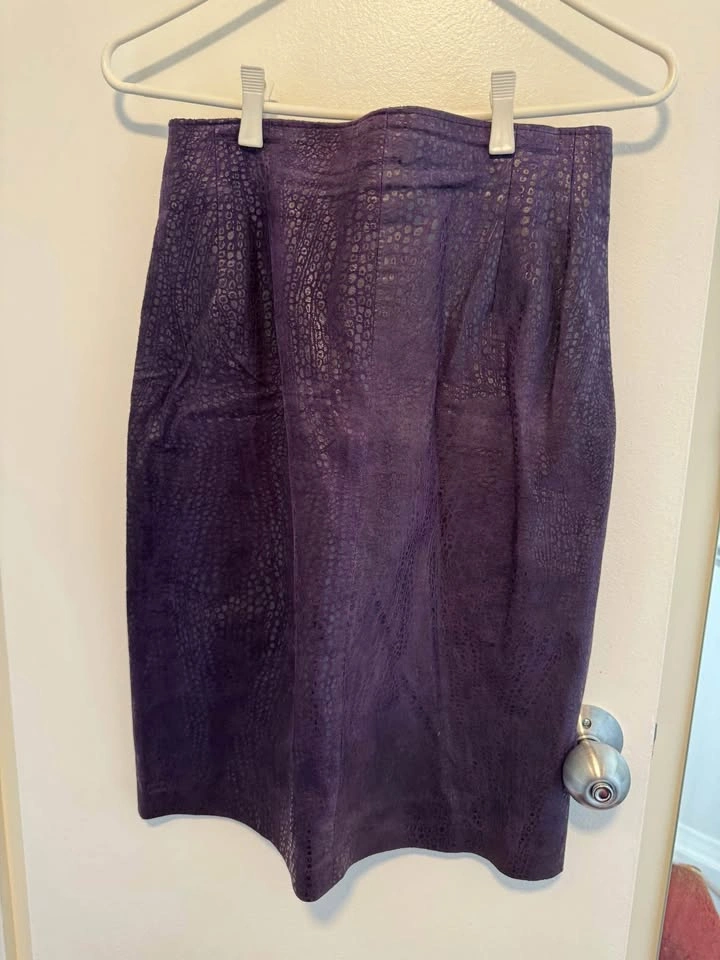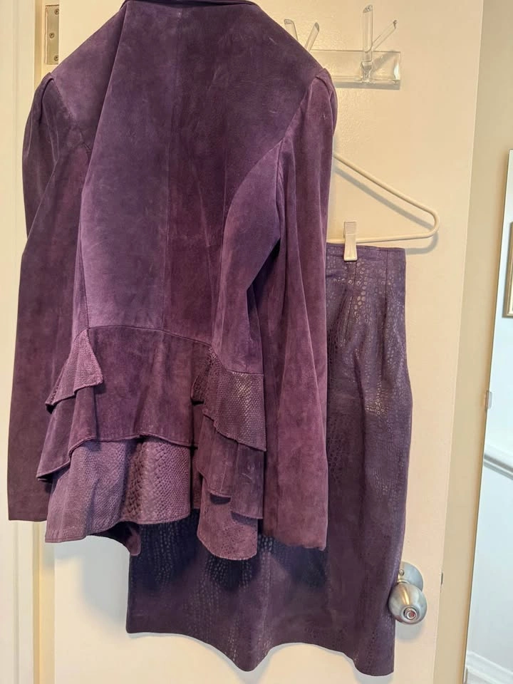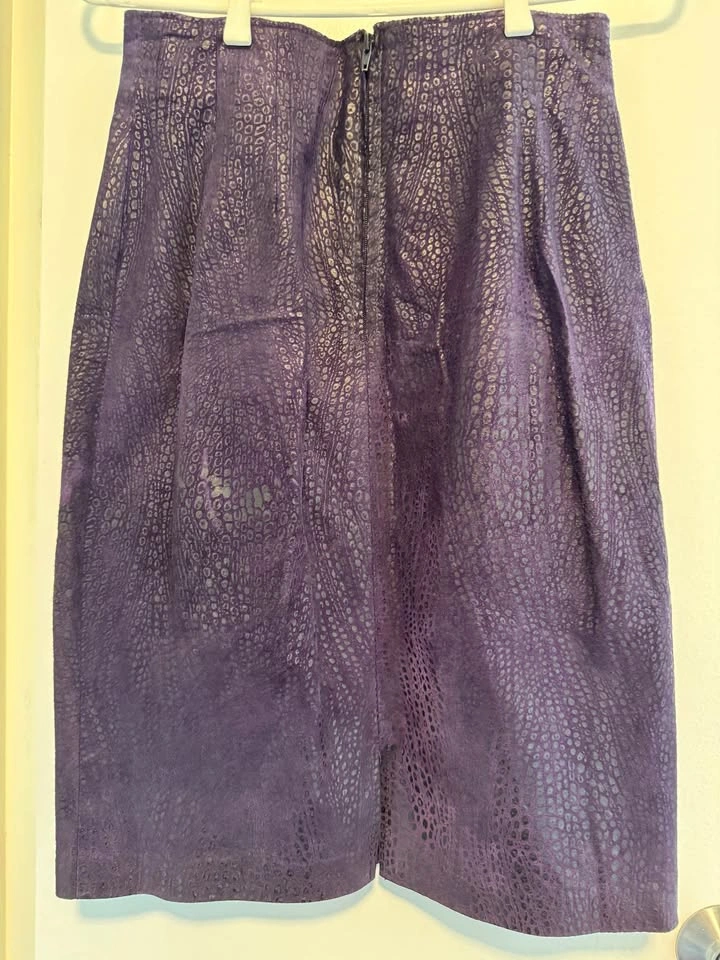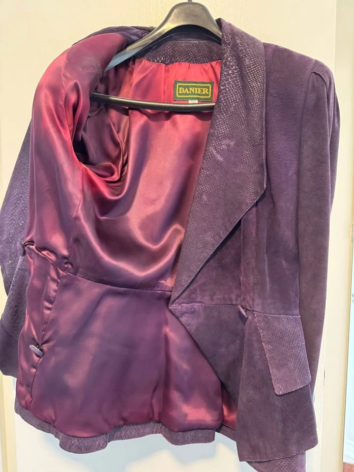 Excellent condition Danier Leather late 80s vintage suede jacket and skirt (snakeskin print) size 8 worn only a few times and stored. Deep Purple colour with lined jacket and skirt.