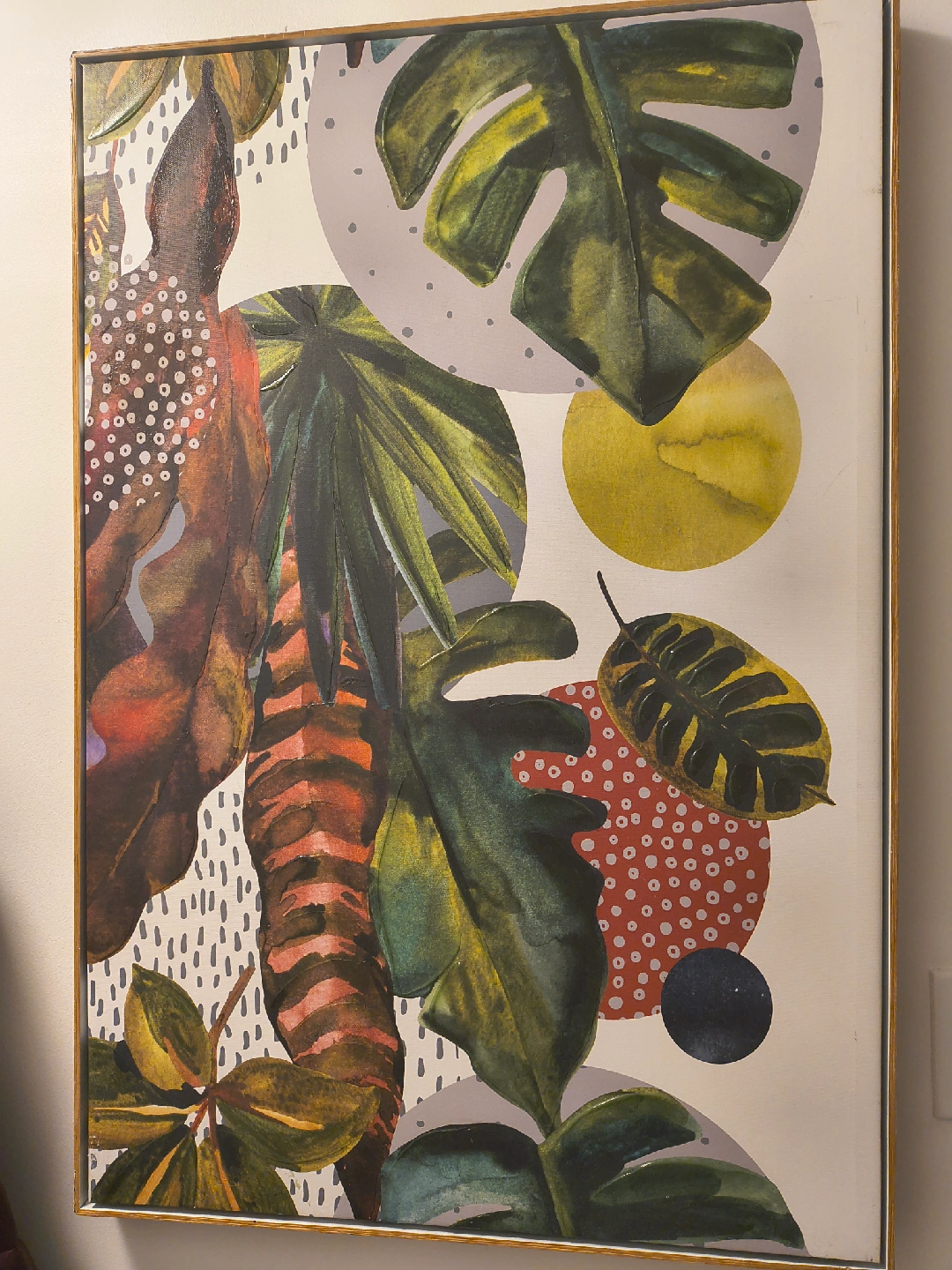 21A beautiful 36"x24" framed art print featuring tropical leaves and geometric shapes. It's in great condition and ready to brighten up any room in your home!