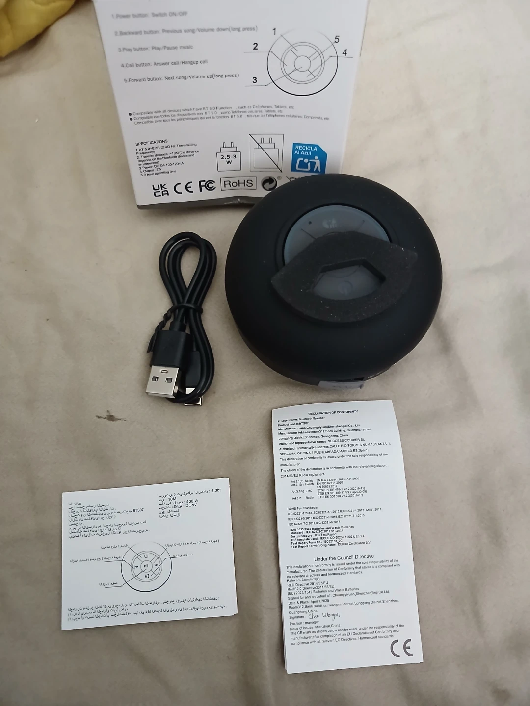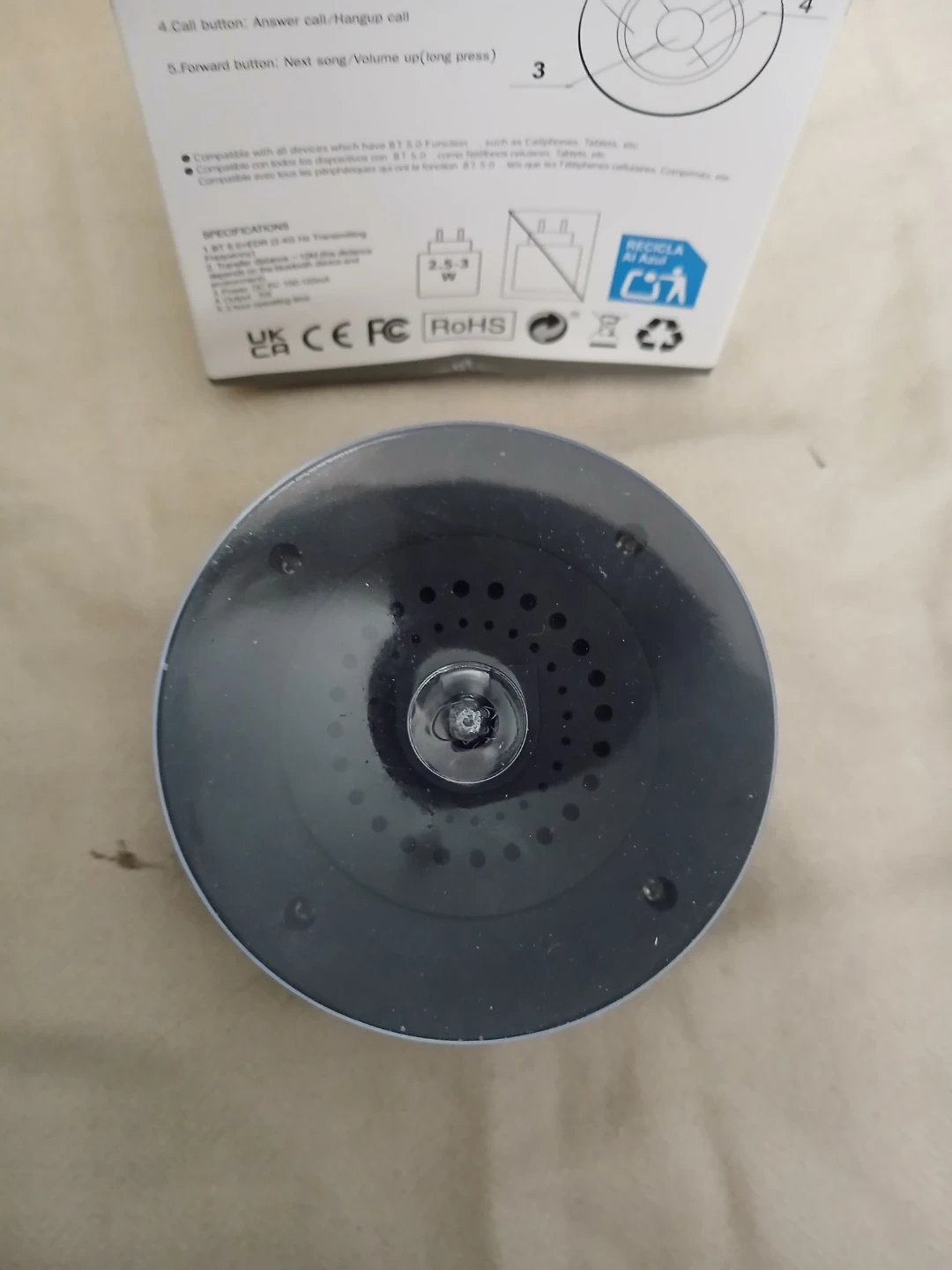 Brand new Compact black splash-proof shower speaker with Bluetooth 5.0 connectivity. Includes USB charging cable and manual. Offers long endurance and hands-free calls. Water-resistant design is great for use in the shower. Cash only. Pick up or meet up in public place. Willing to bargain on the price.
