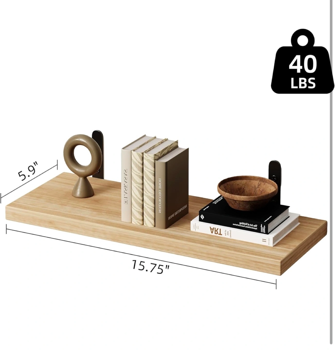 Stylish floating shelf. Black metal brackets, screws and anchors included. Three installation methods available. Holds up to 40 lbs. Perfect for displaying books, decor, etc.