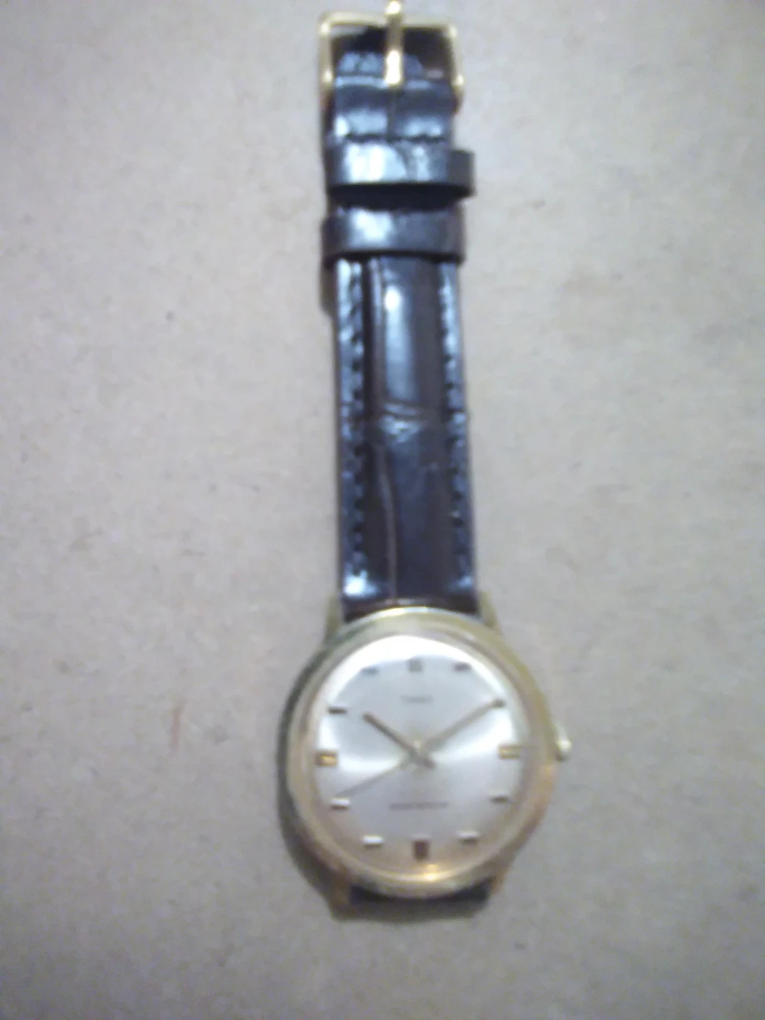 This is a classic Timex watch with a gold-tone case and a black leather strap. It features a simple, elegant design with a silver dial. Water resistance is indicated on the dial.