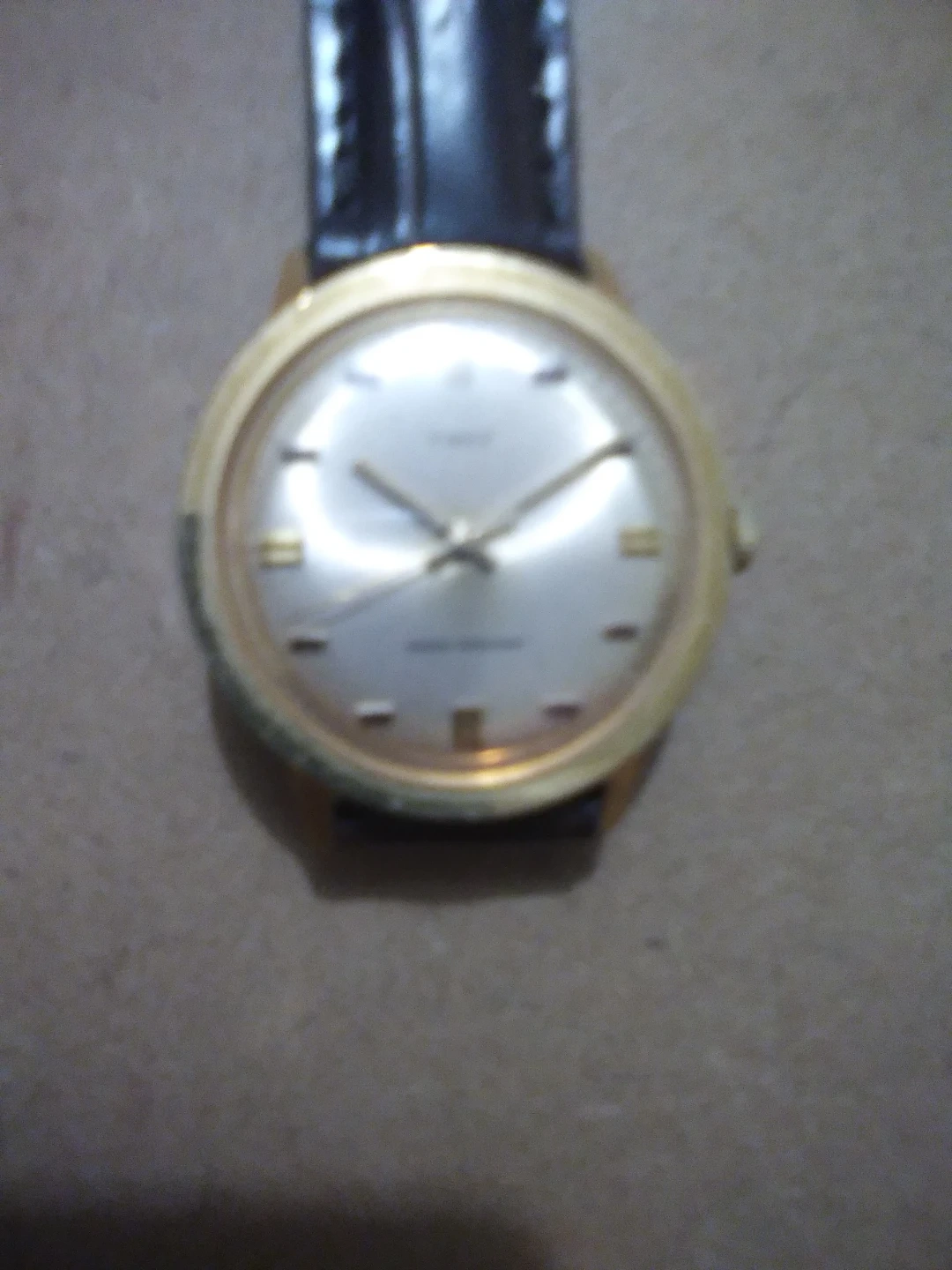 This is a classic Timex watch with a gold-tone case and a black leather strap. It features a simple, elegant design with a silver dial. Water resistance is indicated on the dial.