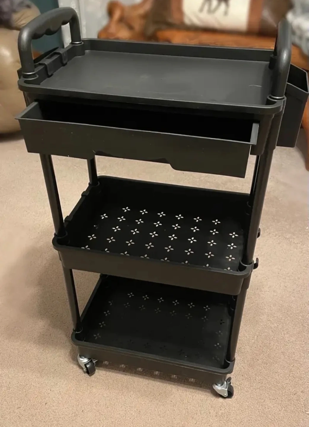 This is a black 3-tier rolling utility cart. It comes with a top tray, a pull-out drawer, and two basket shelves. It has wheels for easy mobility.