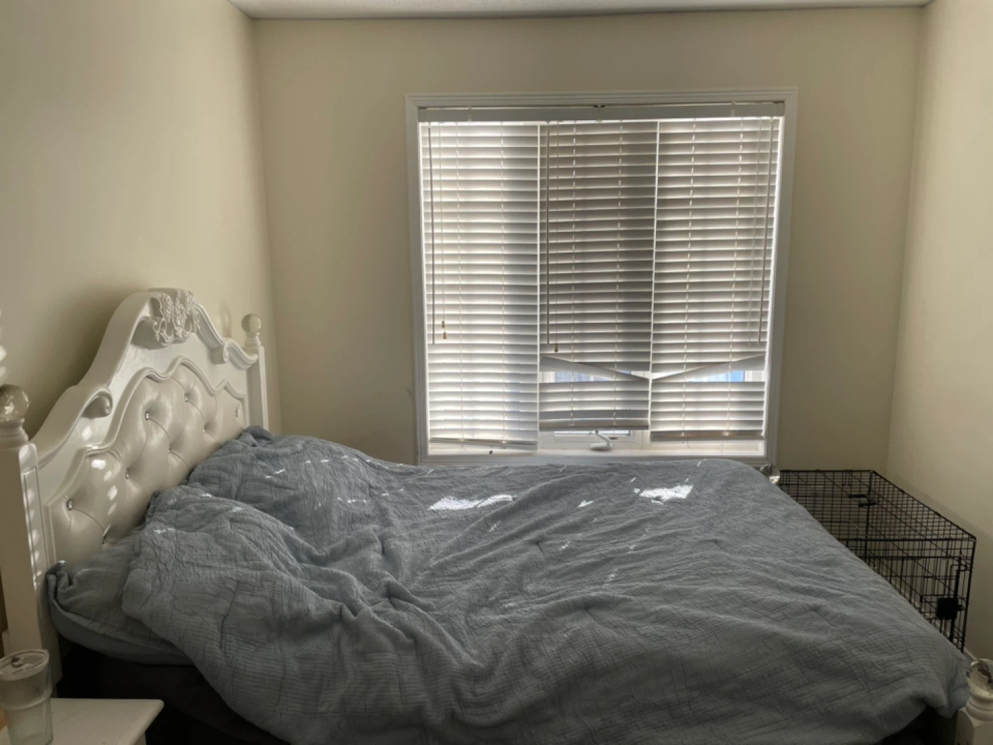 Elegant white bed frame with a tufted headboard and crystal-like accents. It features ornate detailing and a padded centre section. This bed is a nice addition to a bedroom!