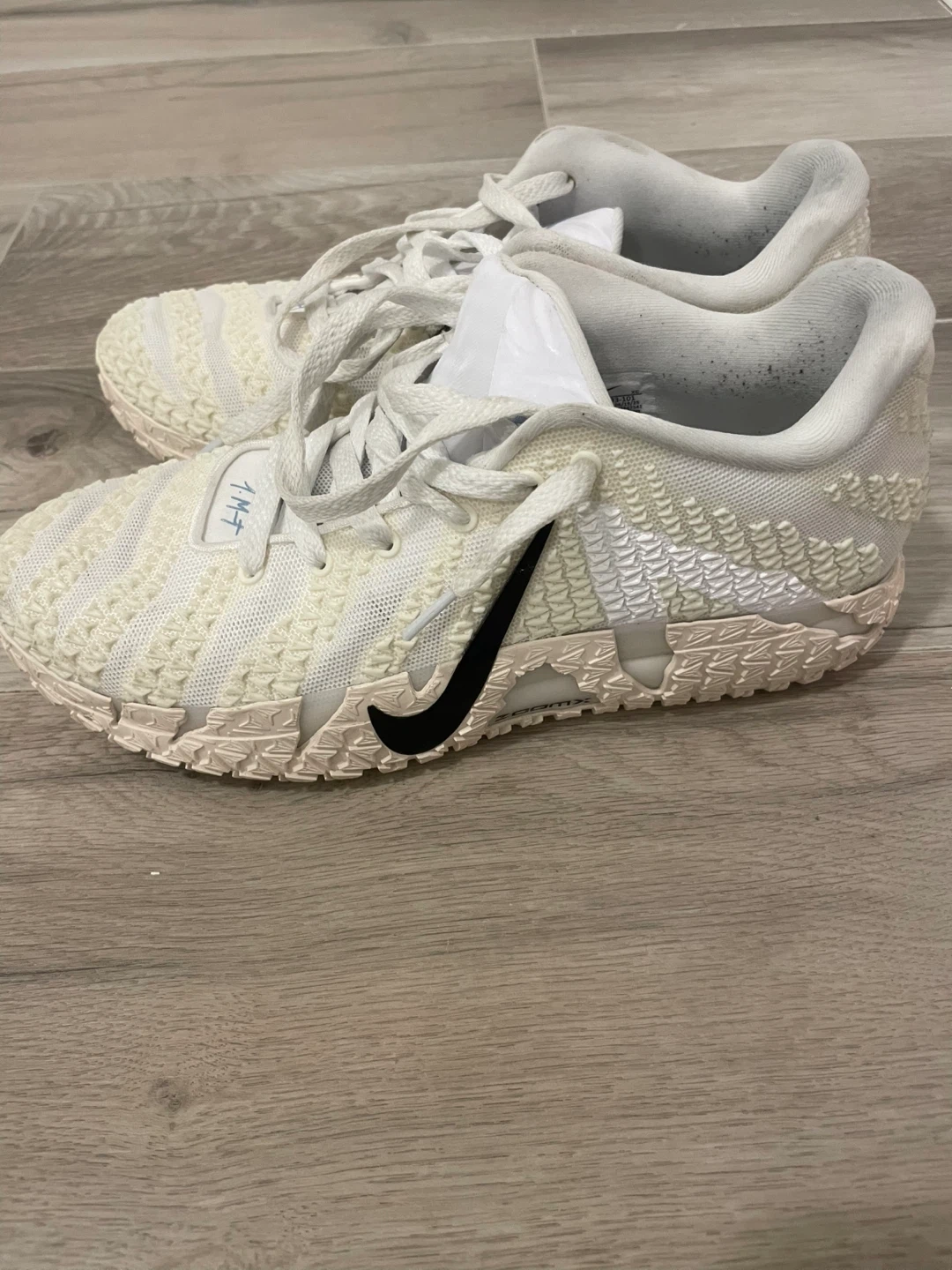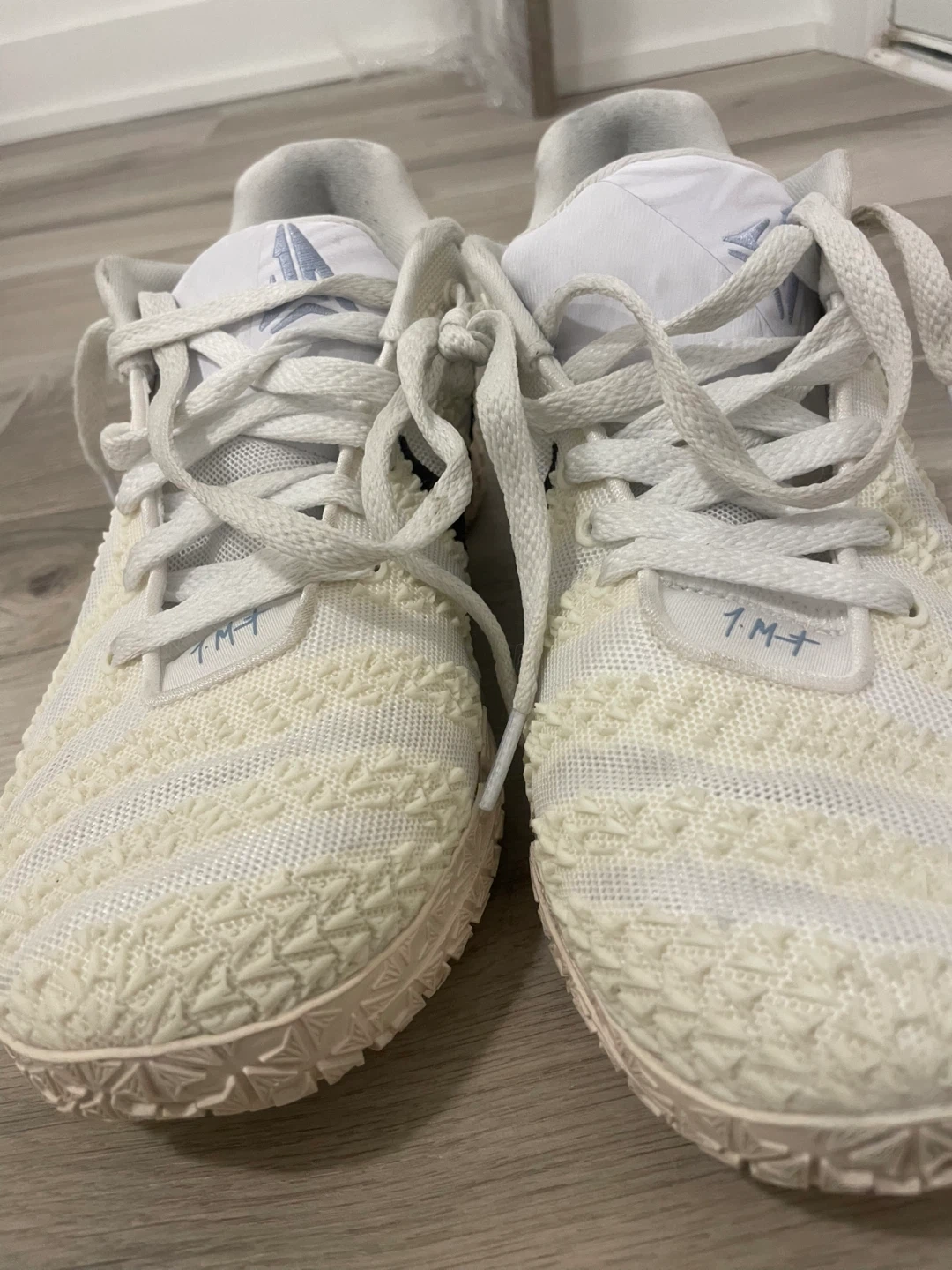 Selling a pair of Nike KD12 basketball shoes in a size 9.5. They are white with a black swoosh and have 'TWELVE' embroidered on the back. Please check out the photos for a closer look!