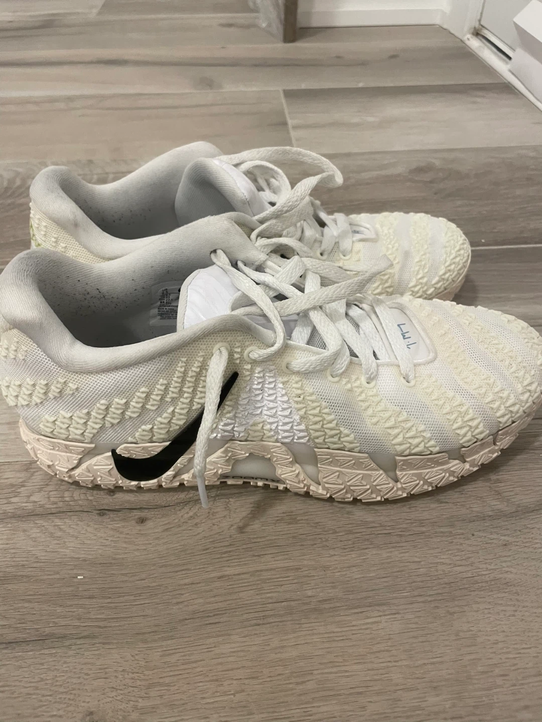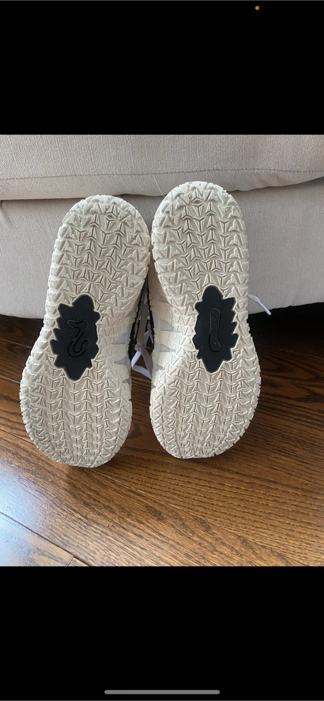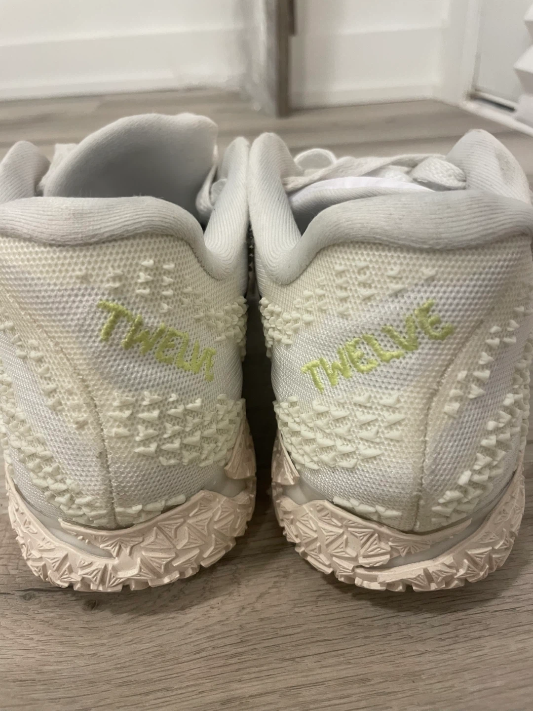 Selling a pair of Nike KD12 basketball shoes in a size 9.5. They are white with a black swoosh and have 'TWELVE' embroidered on the back. Please check out the photos for a closer look!