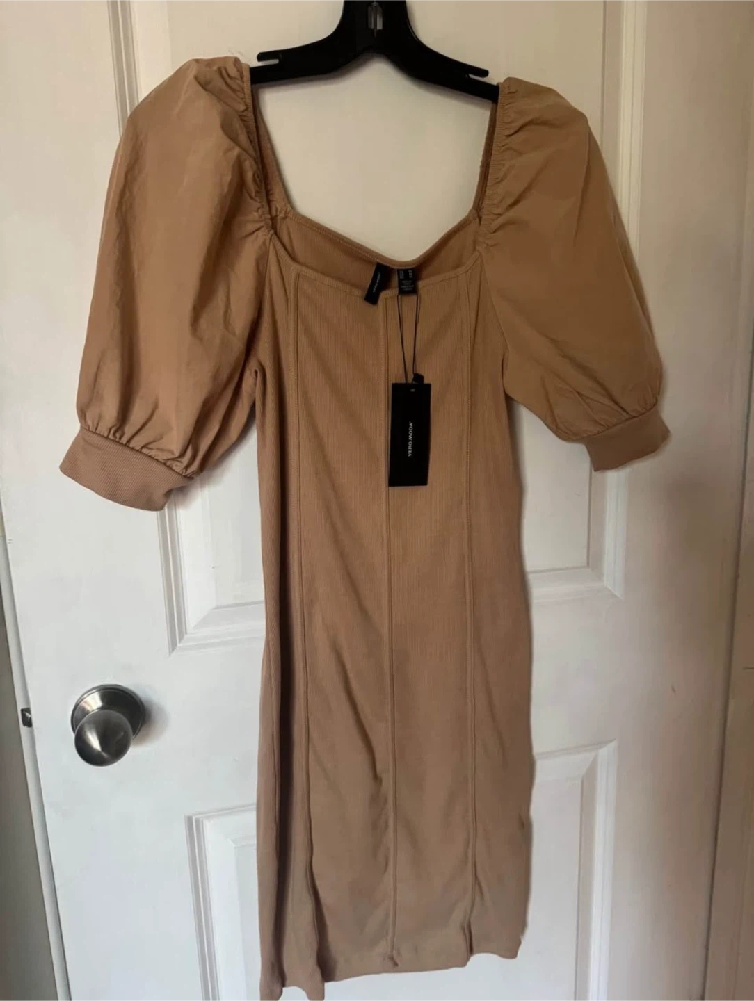 Selling a cute Vero Moda mini dress in a beige colour! It's a size small and has a unique design with puff sleeves. Perfect for a casual day out or a summer event!
