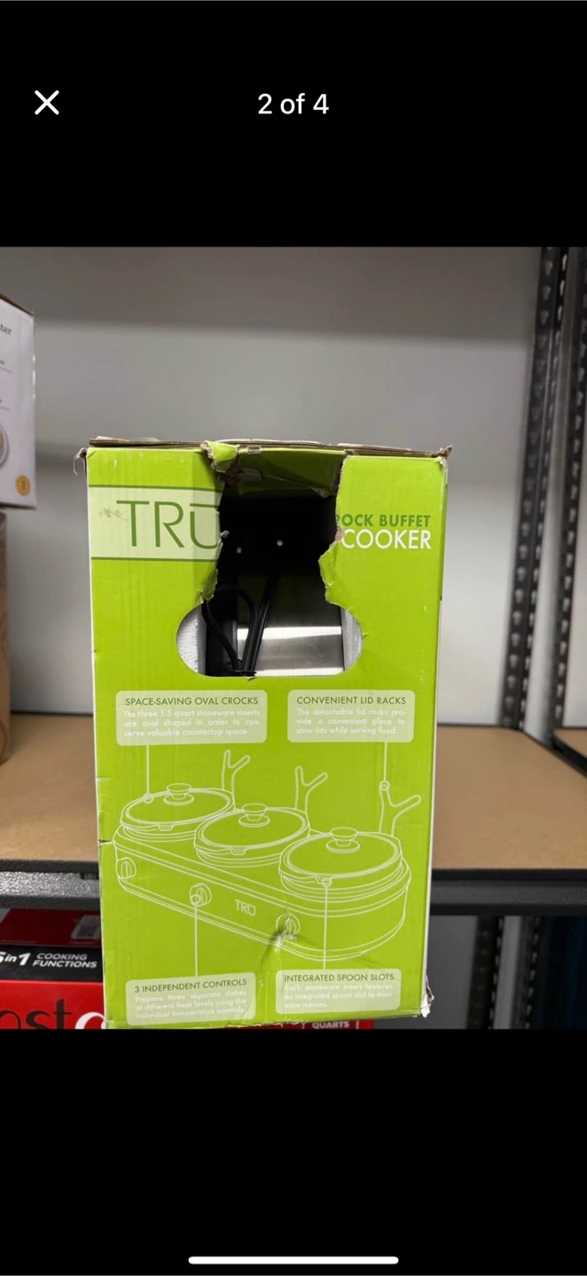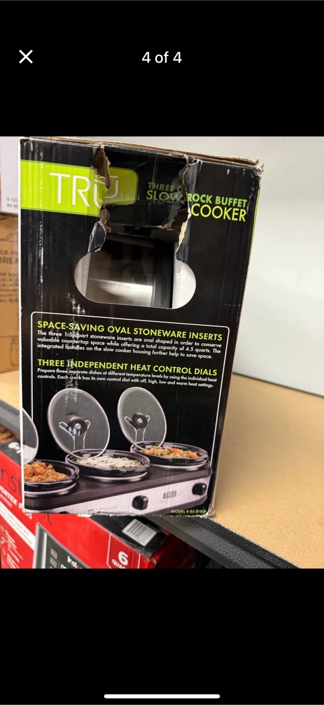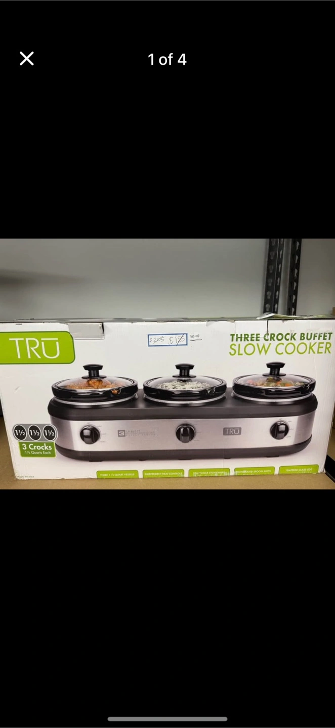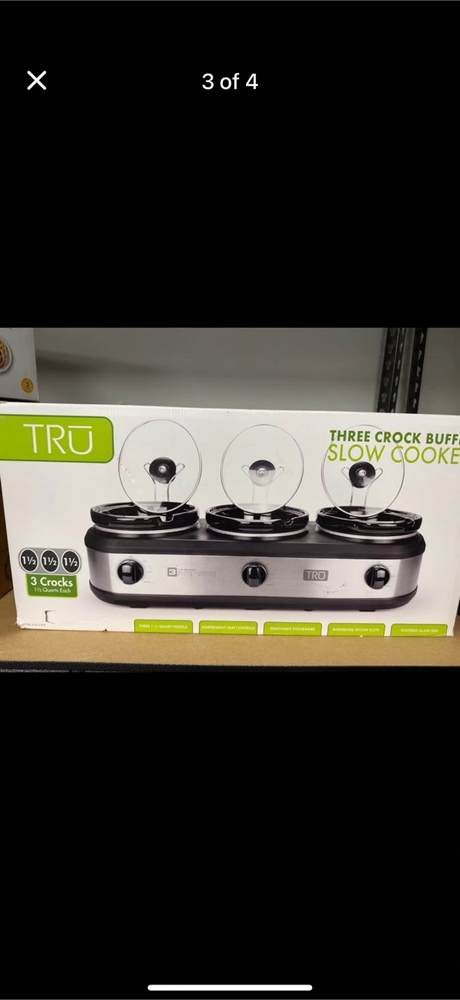 Selling a Tru Three Crock Buffet Slow Cooker. It features space-saving oval stoneware inserts, convenient lid racks, and integrated spoon slots. It also has three independent heat control dials
