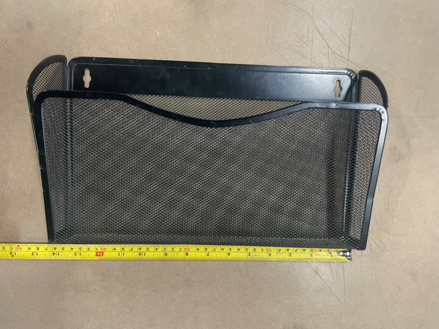 This is a black mesh wall file holder. It's made of metal mesh. Dimensions are approximately 13 inches wide and 9 inches tall.