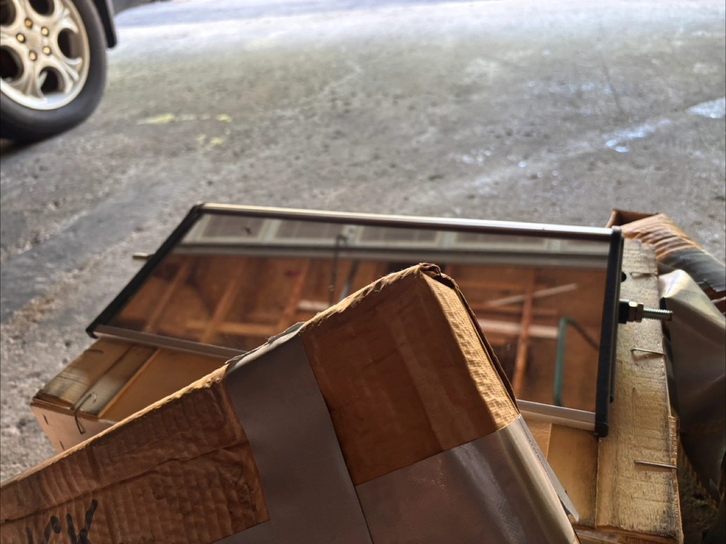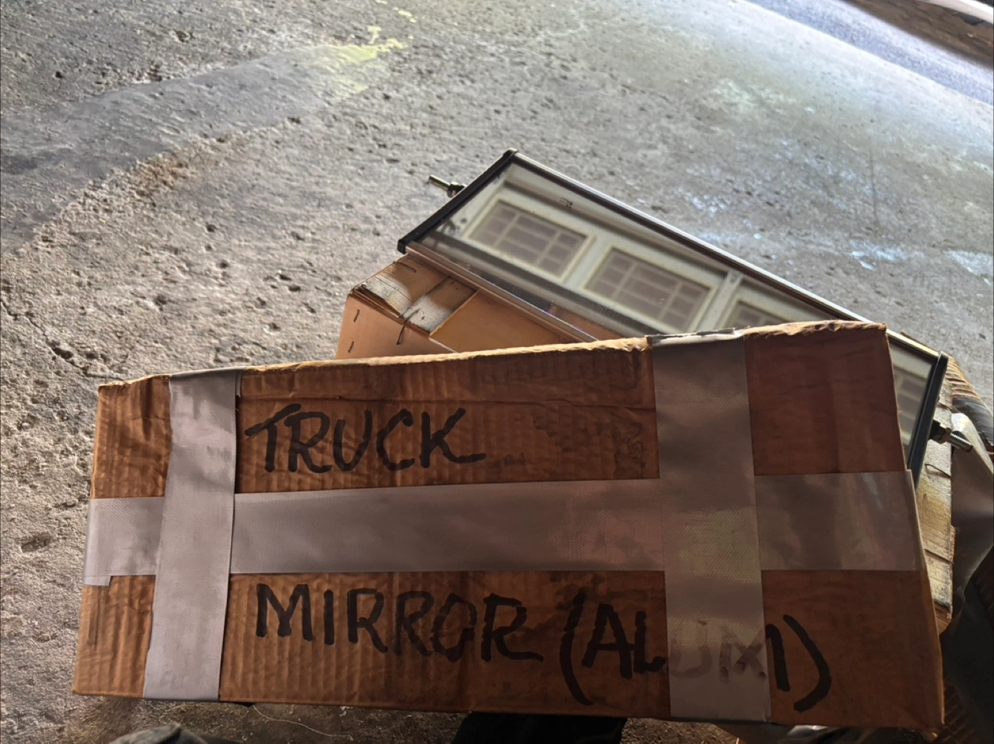 Cardboard box. Taped shut with the words "TRUCK MIRROR (ALUM)" written on it in marker. An exterior vehicle mirror rests on top of the box. A perfect addition to your vehicle.