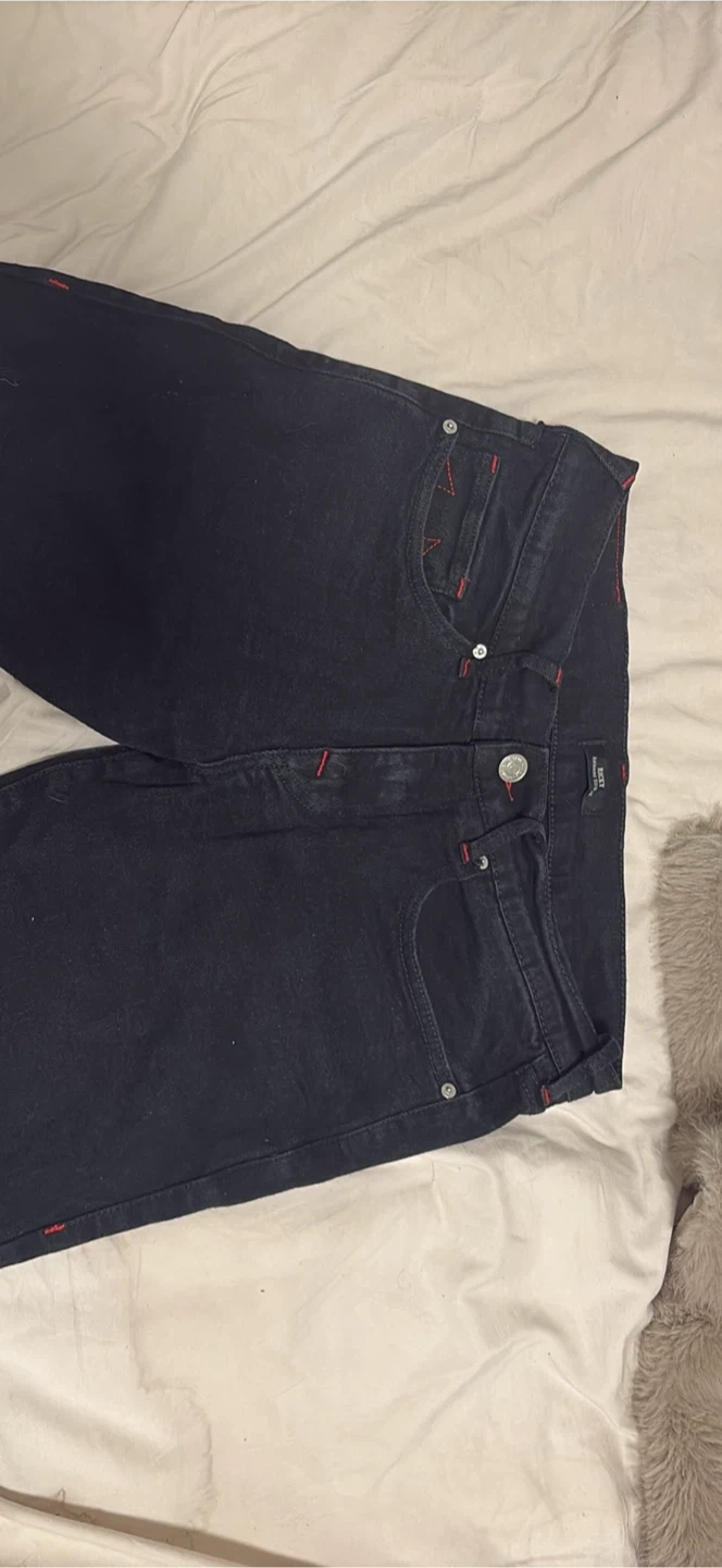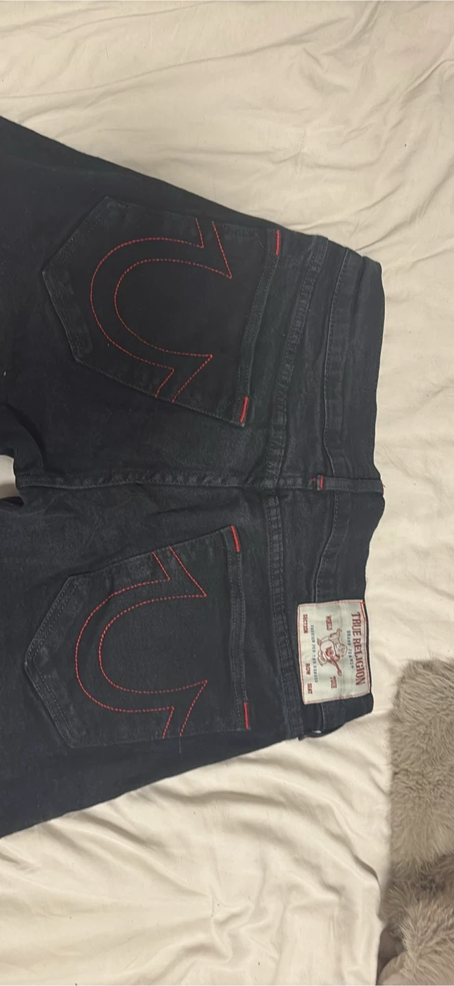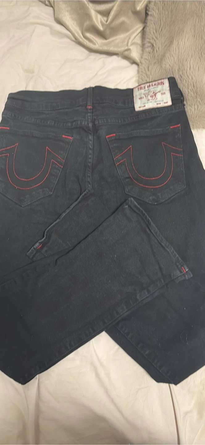 0True Religion jeans in black with red stitching! A stylish and unique pair of jeans, perfect for adding a bit of flair to your wardrobe. They're in great condition and ready for a new home