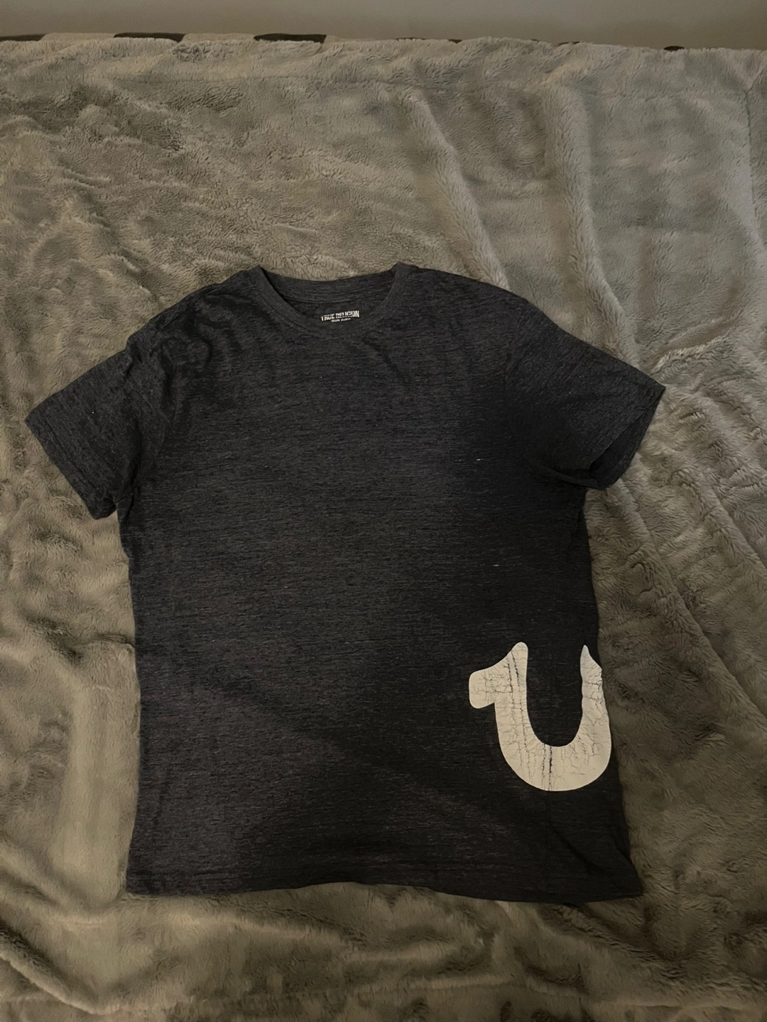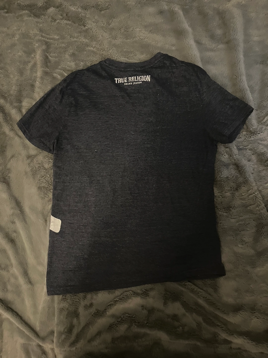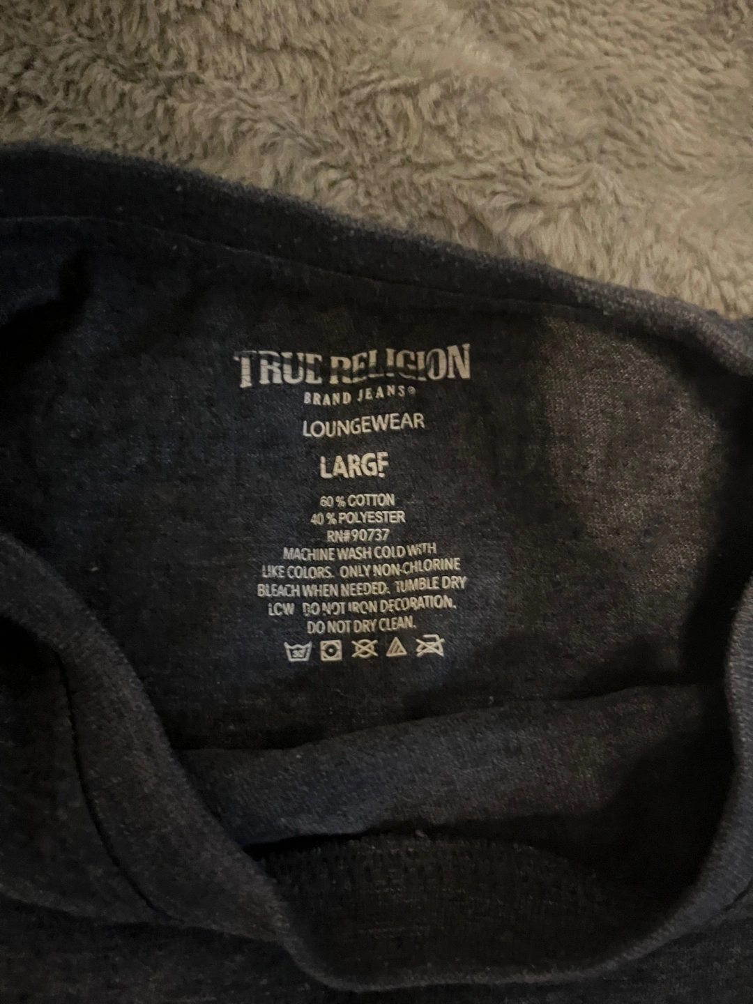 20True Religion T-Shirt in size large. It's made of 60% cotton and 40% polyester. Machine wash cold with like colors, only non-chlorine bleach when needed, tumble dry low, do not iron on decoration, do not dry clean. A little messed up on logo but overall great shirt.