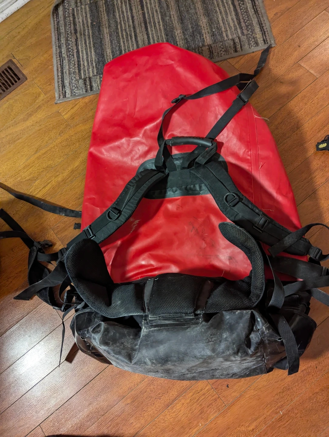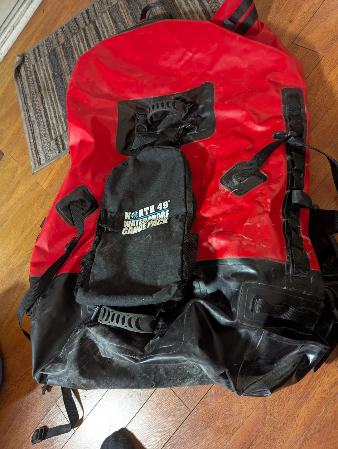 This is a North 49 waterproof canoe pack. It's bright red and black with adjustable shoulder straps and a padded back. This pack is designed for carrying gear on canoe trips. Size is 120 L. Works perfectly.