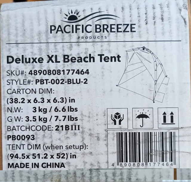 NEW Pacific Breeze Easy Setup Beach Tent Deluxe XL, still in boxes. Asking $95 FIRM (Retail $200+). Located in Summerside, SE London. Smoke-free home. Message to arrange pickup only. This tent features an easy setup hub system, is lightweight and compact. Provides protection from sun, rain, and wind with UPF 50+ sun protection and 3 large windows for ventilation. Made from breathable, water-repellent polyester. Spacious interior comfortably fits 3-4 people. Includes internal pockets and hooks. Durable fiberglass frame and water-resistant PE floor. Comes with a carrying case, sand pockets for stability, and 4 stakes.