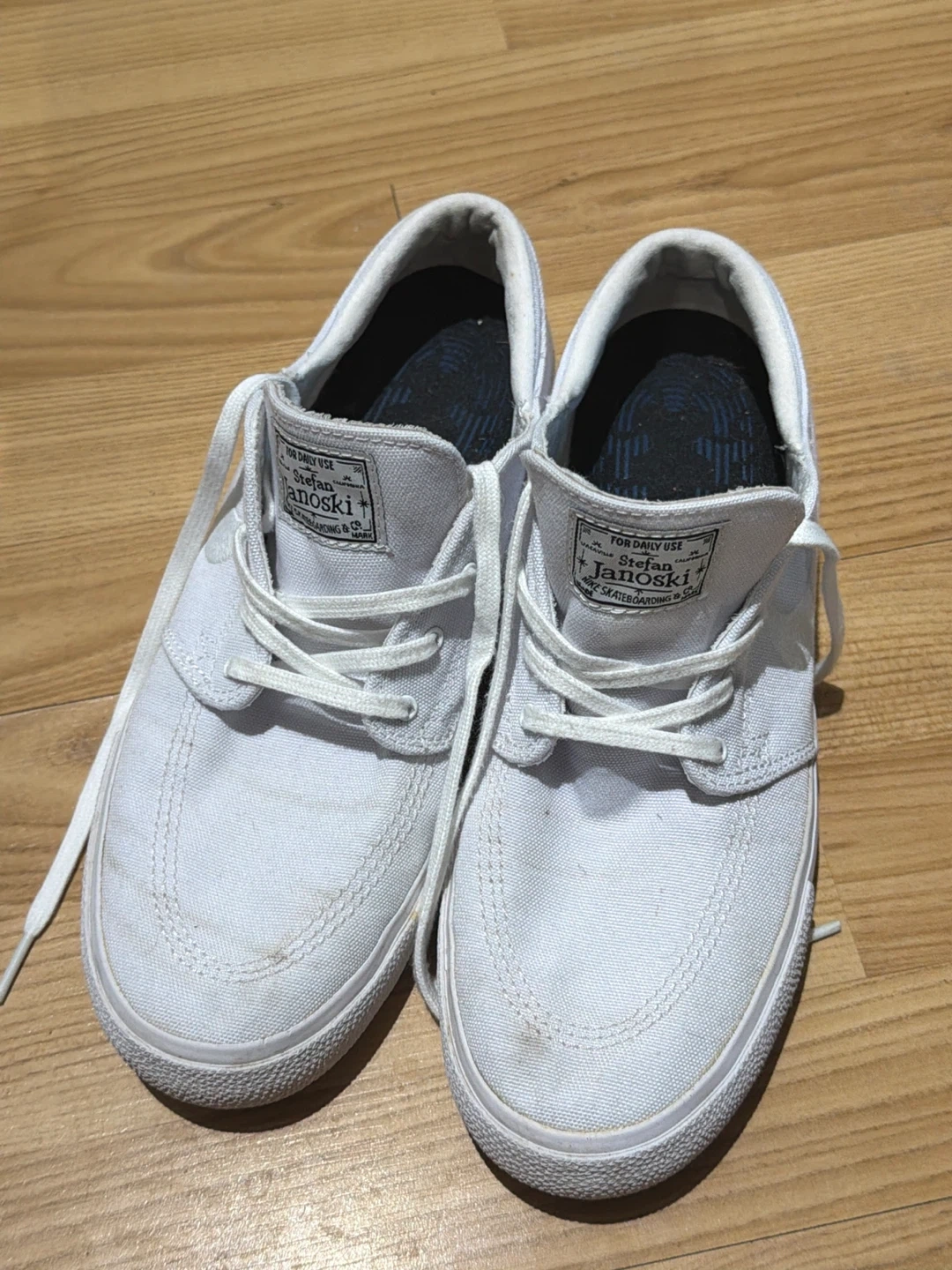 These are white Nike Stefan Janoski canvas sneakers. They're a US size 8, EUR 41, UK 7. Made in China. These shoes are great for daily skateboarding use!