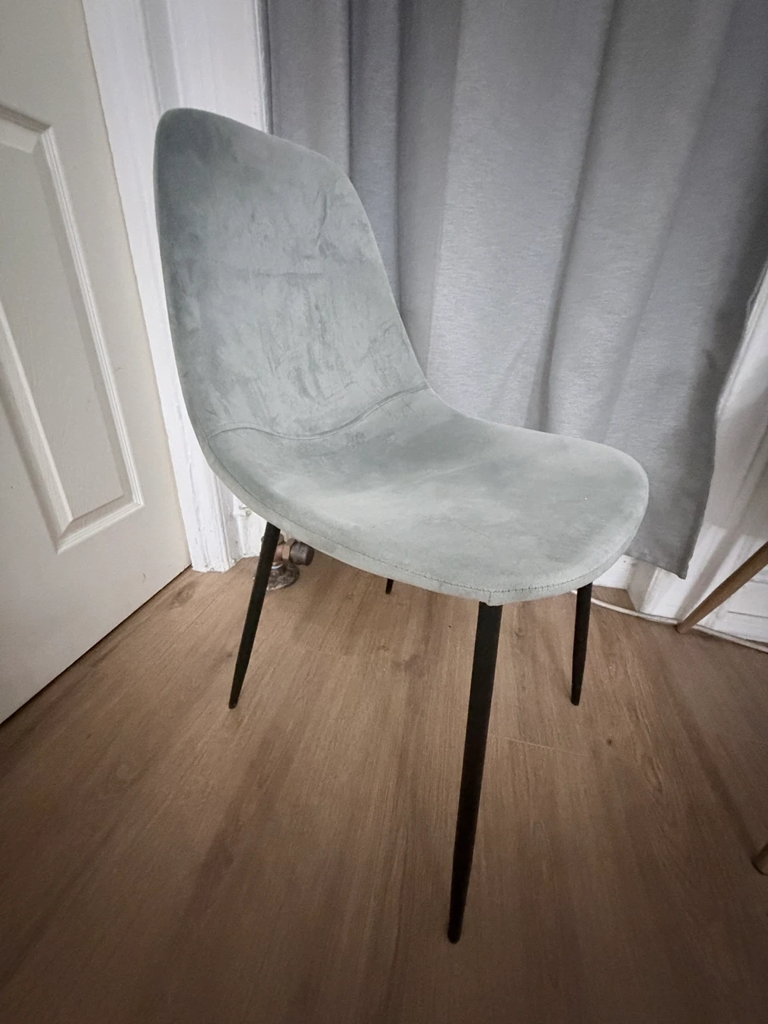 Selling a teal dining chair. It's in great condition and ready for a new home! The chair has black legs and a comfortable seat.