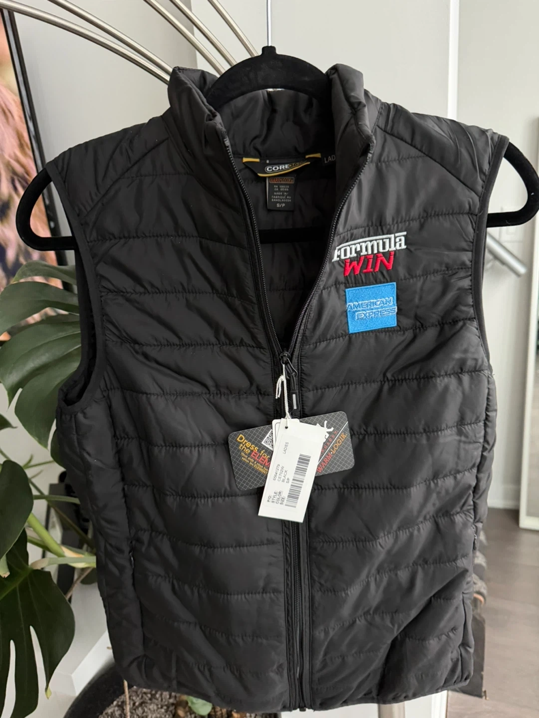 This black puffer vest features "Formula 1” and American Express logos. It's a sleeveless, quilted outer layer with a stand-up collar. Great for staying warm while showing off your racing spirit!