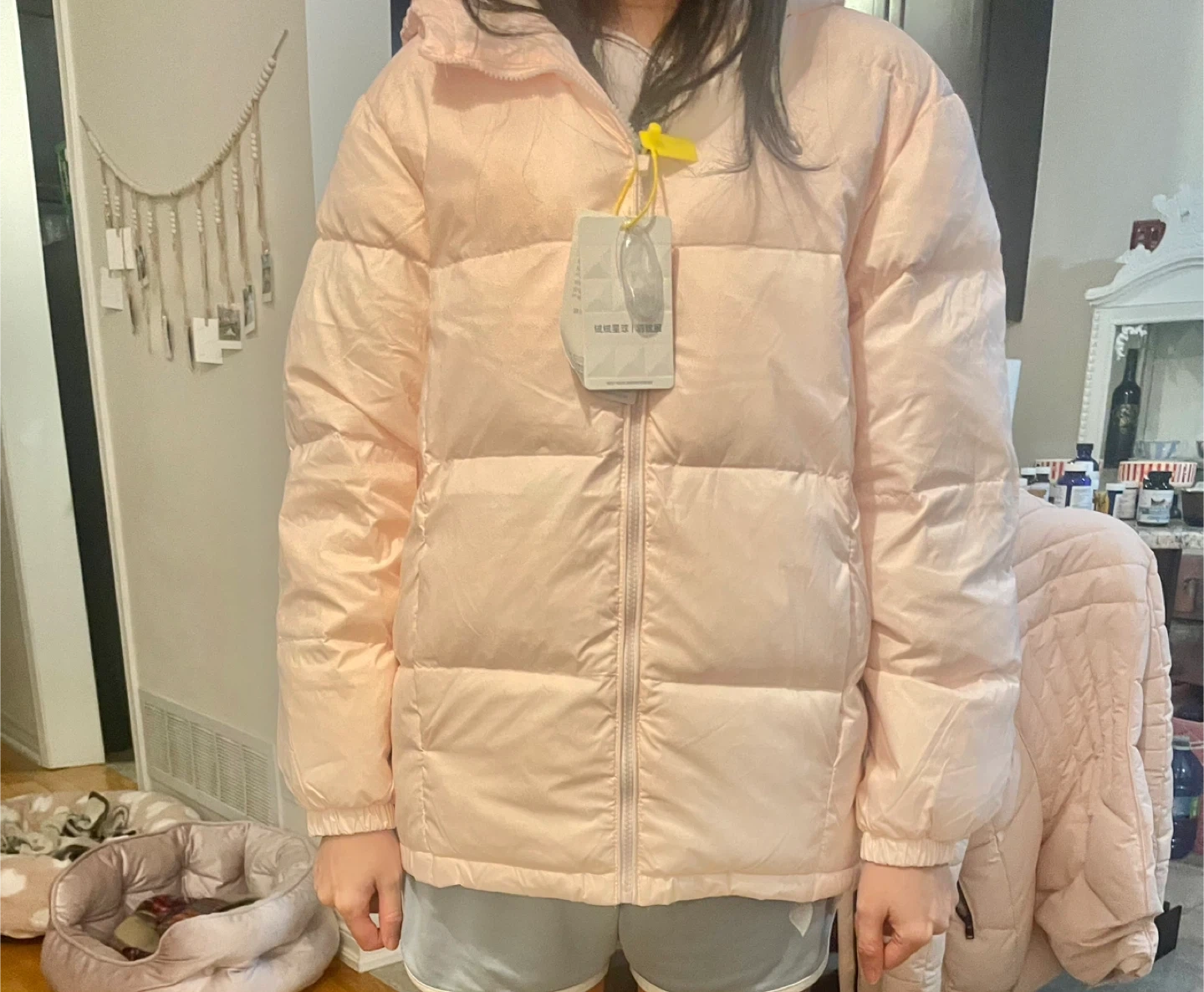 Selling a cute pink puffer jacket! It's in great condition and perfect for staying warm during the colder months. The jacket features a hood and a zippered front.