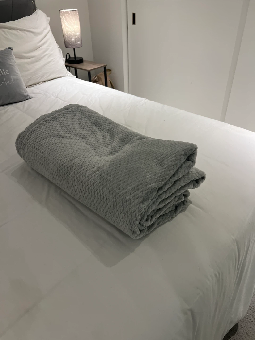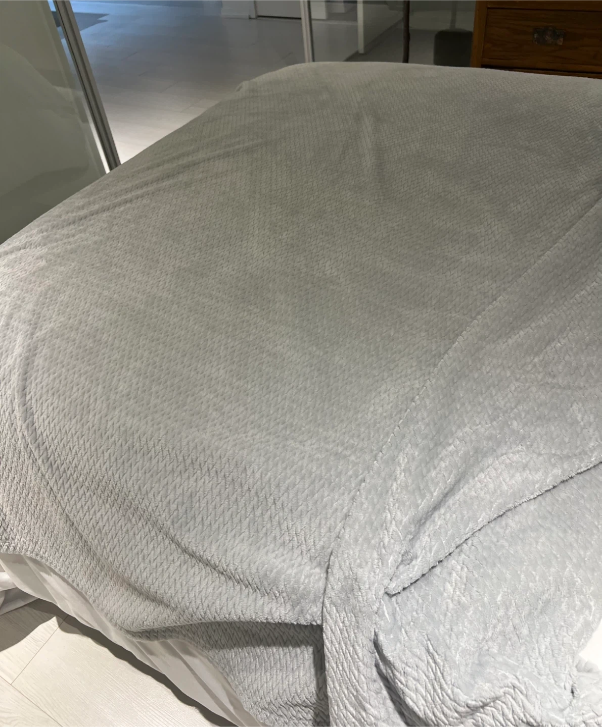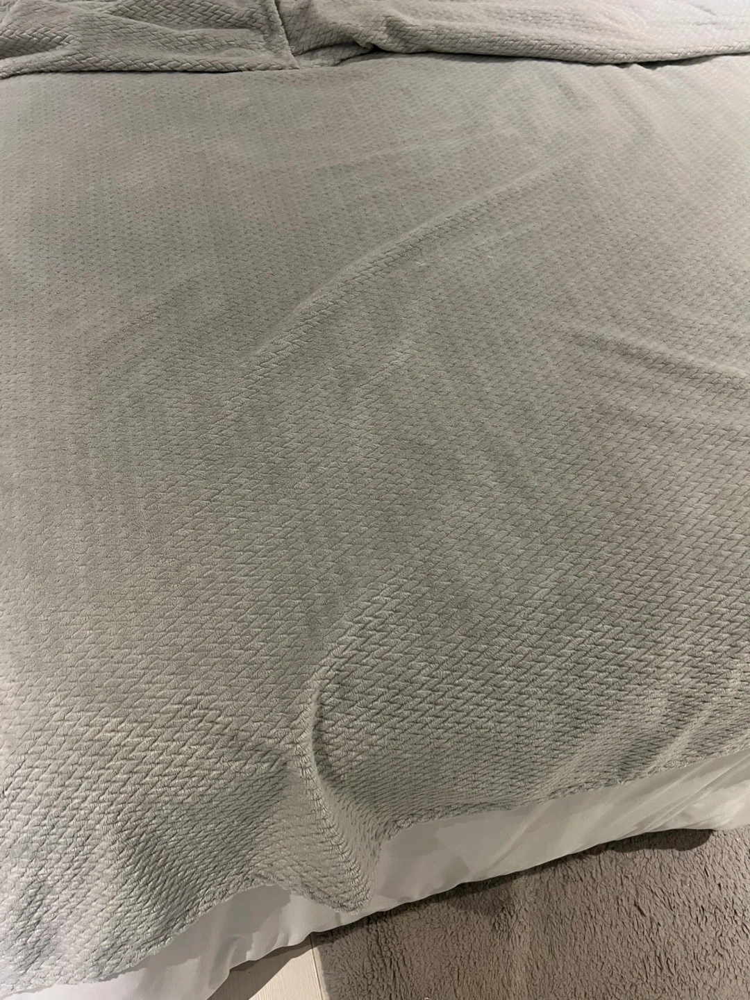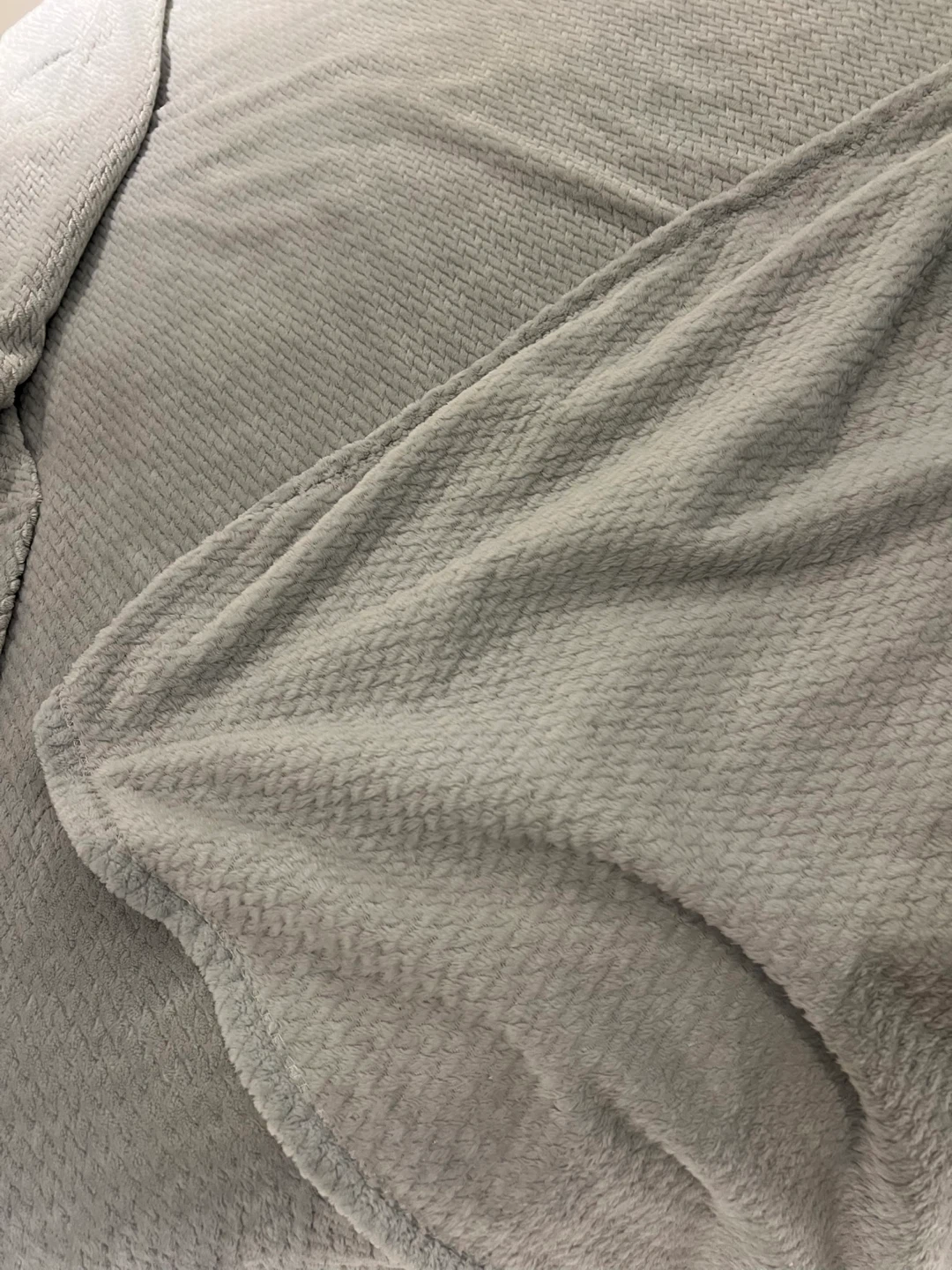 This cozy, grey fleece throw blanket features a subtle textured pattern.