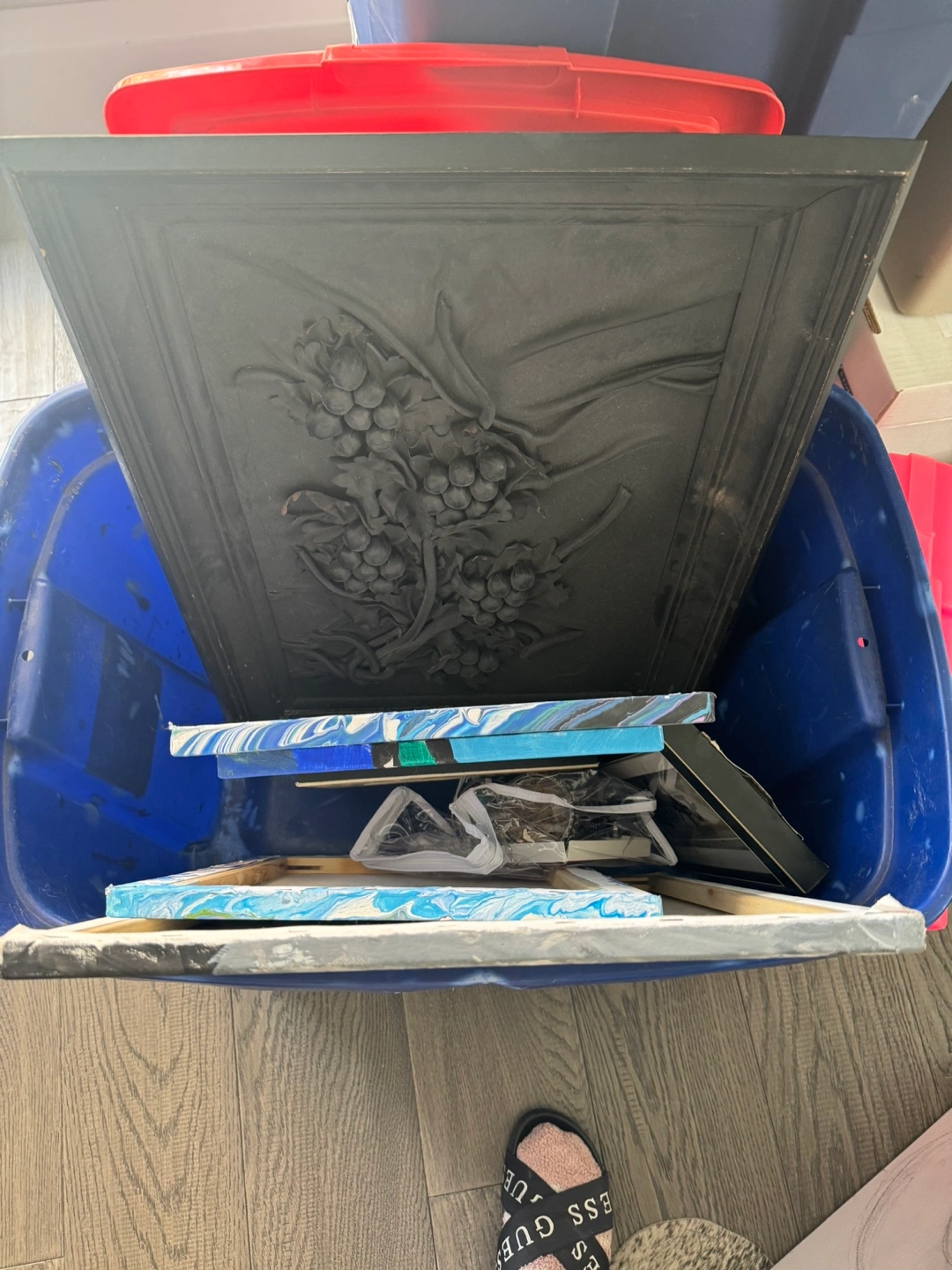 Black framed wall decor with a 3D design of a bunch of grapes. The frame is made of wood. It has a nice finish. It is in good condition. It measures approximately 18 inches by 24 inches.
