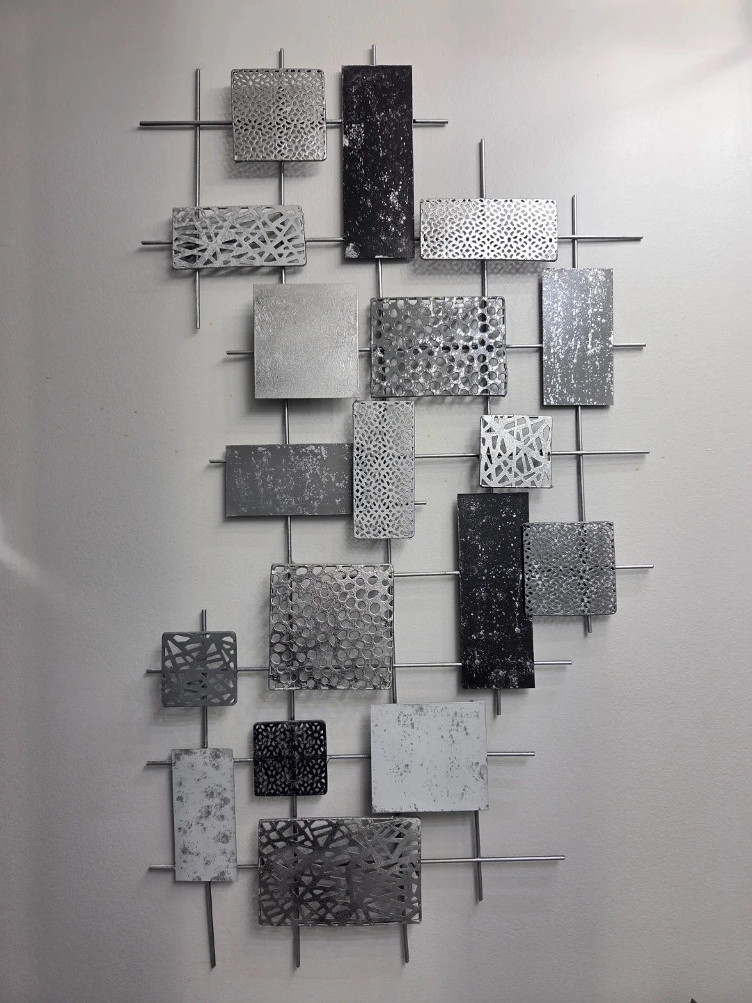 This decorative wall art features a modern geometric design with mixed metallic finishes. It's constructed from metal with various patterns and textures. This piece adds a unique contemporary touch to any room.