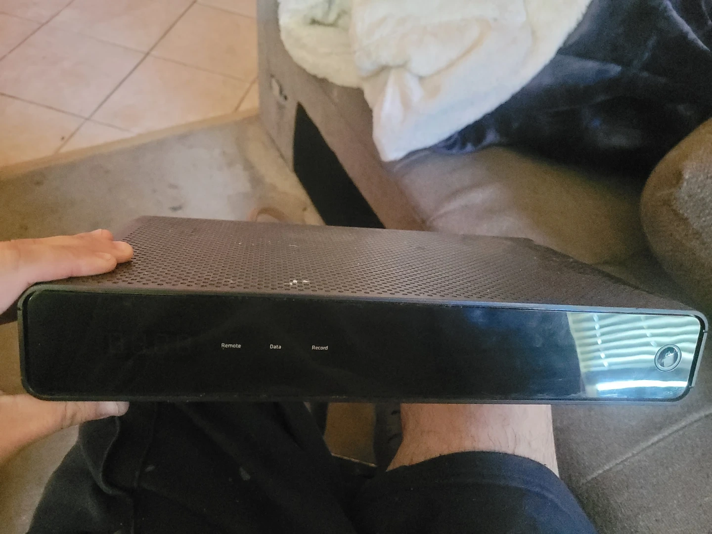 This is a black cable box receiver. It has indicator lights for remote, data, and record functions. It's a standard electronic device for your home entertainment setup.