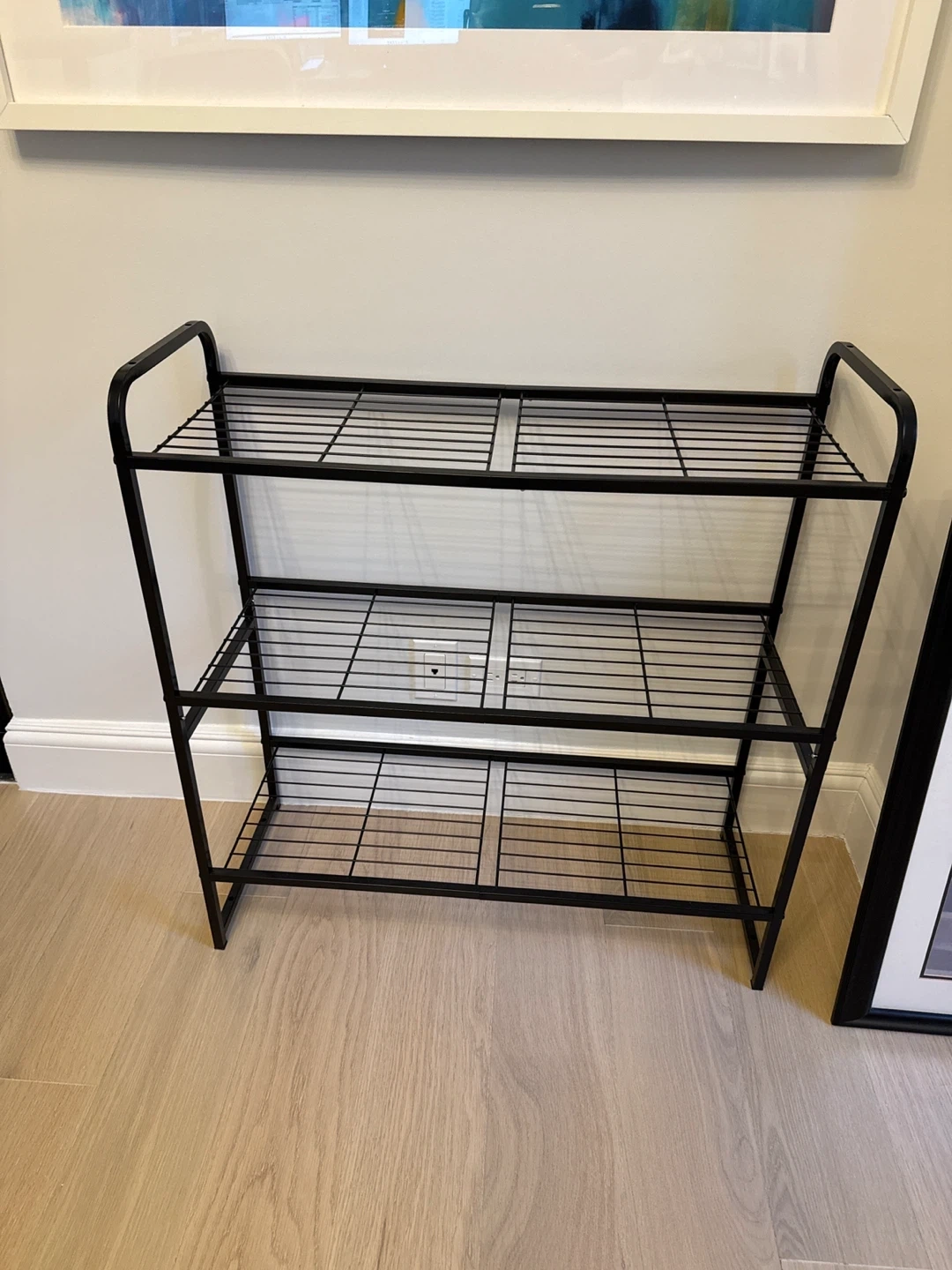 Black metal and has a simple, open design. It's great for organizing books, pantry etc.