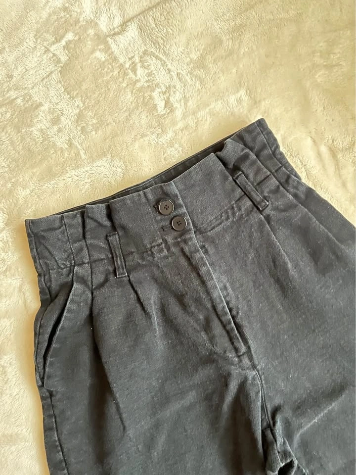 Dark blue, cropped, hollywood waist trousers from Oak and Fort. High waisted, and legs are a bit baggy, really nice fit. Pick up only in the west end.
