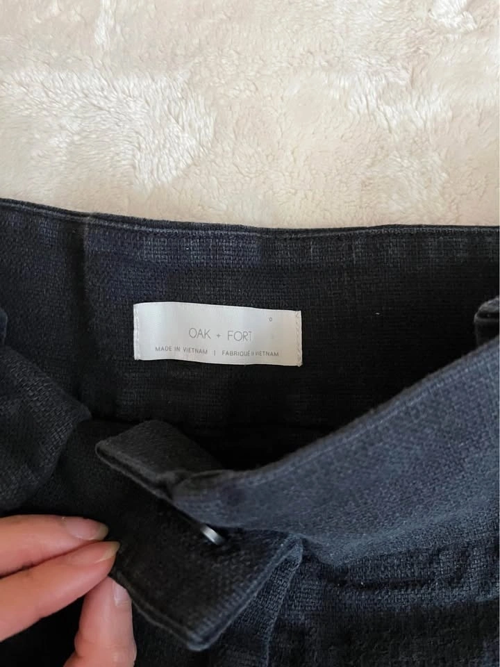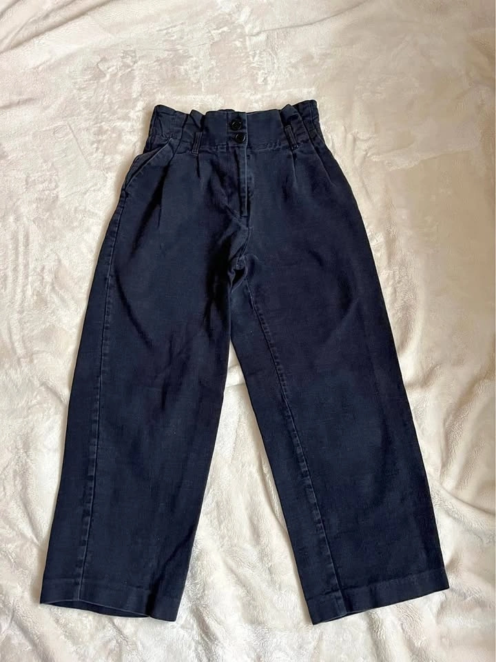 Dark blue, cropped, hollywood waist trousers from Oak and Fort. High waisted, and legs are a bit baggy, really nice fit. Pick up only in the west end.