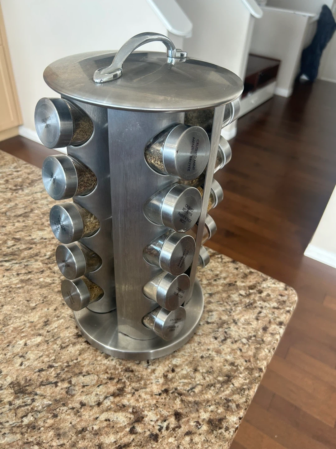 This stainless steel spice rack holds 16 spice jars. It's designed for easy access to your favourite seasonings. Keep your kitchen counter organized with this rotating rack!