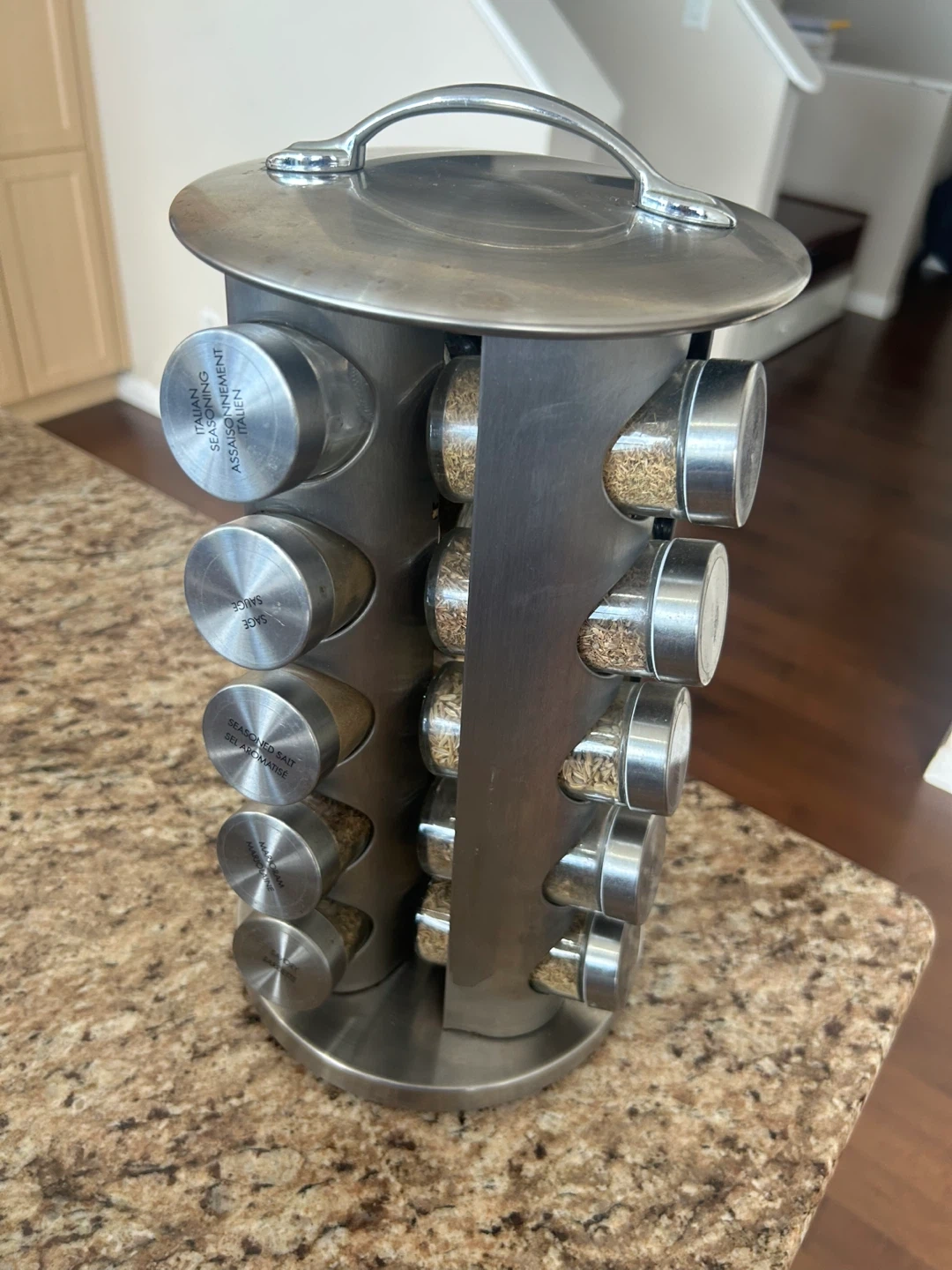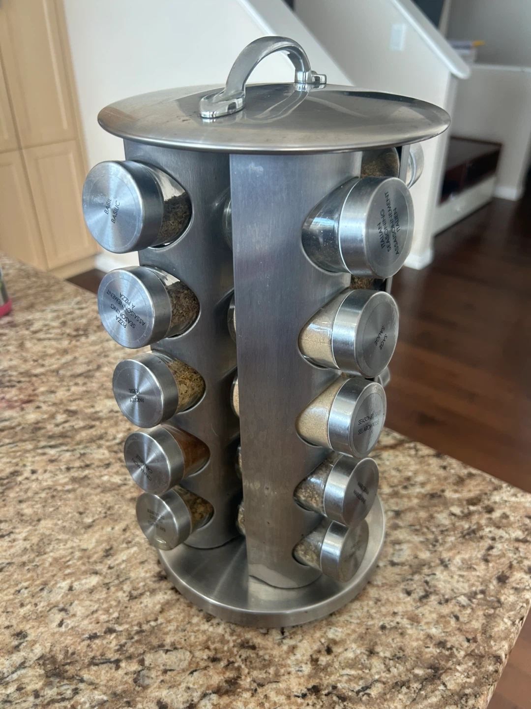 This stainless steel spice rack holds 16 spice jars. It's designed for easy access to your favourite seasonings. Keep your kitchen counter organized with this rotating rack!