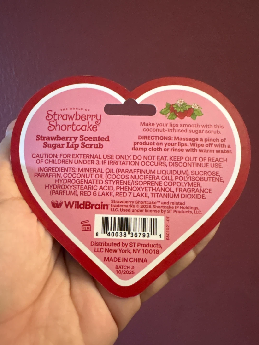 Strawberry Scented Sugar Lip Scrub from The World of Strawberry Shortcake. Contains coconut-infused sugar scrub. Make your lips smooth with this scrub. Massage a pinch onto lips, wipe off with a damp cloth or rinse with warm water. New