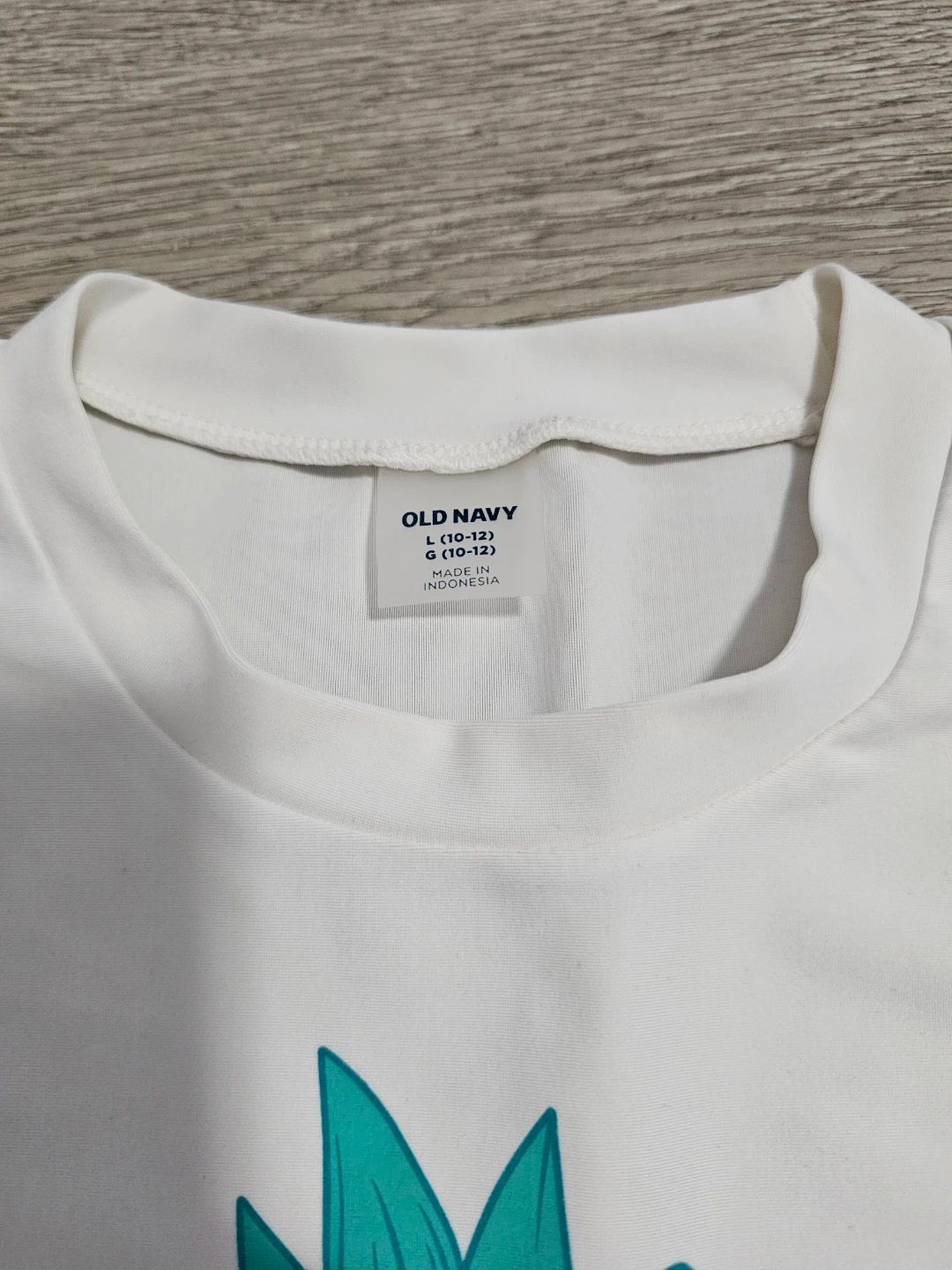 This is a white Old Navy rash guard for girls. It features a colourful pineapple graphic with a tropical scene inside. The size is L, fitting 8-10 years old.perfect for beach/pool day.