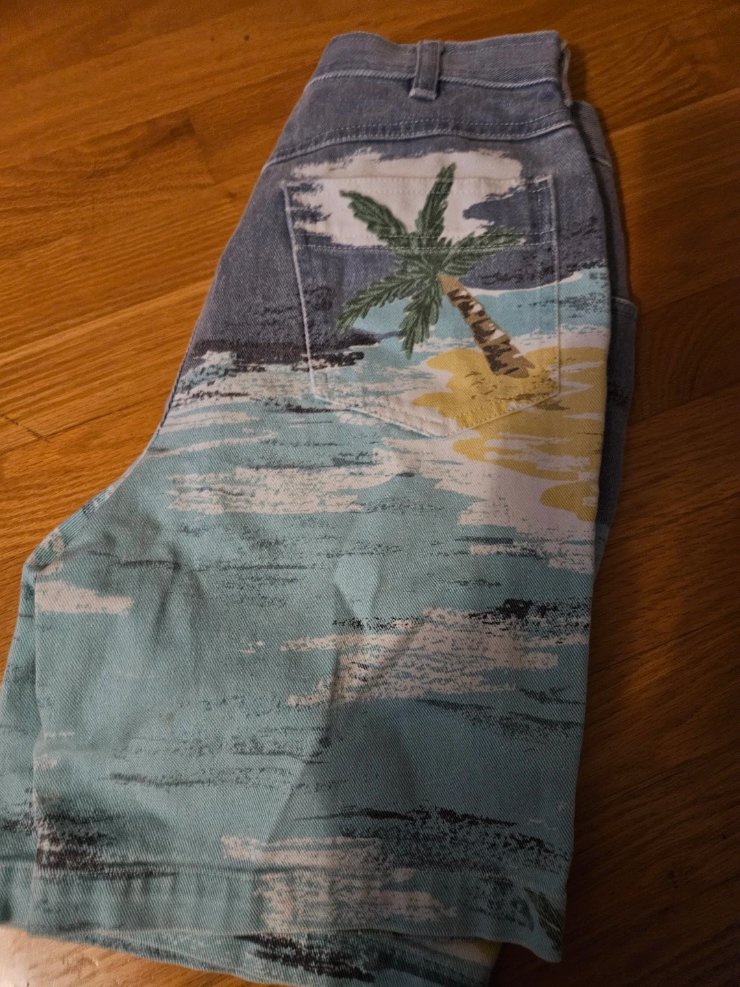 Selling these cool vintage denim shorts with a beach print. They're perfect for summer and have a unique, retro vibe. The denim is sturdy and the print is eye-catching. Great for casual outings or adding a fun touch to your wardrobe!