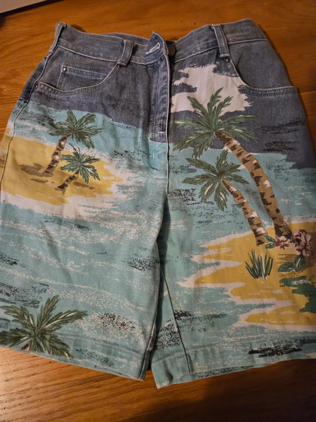 Selling these cool vintage denim shorts with a beach print. They're perfect for summer and have a unique, retro vibe. The denim is sturdy and the print is eye-catching. Great for casual outings or adding a fun touch to your wardrobe!