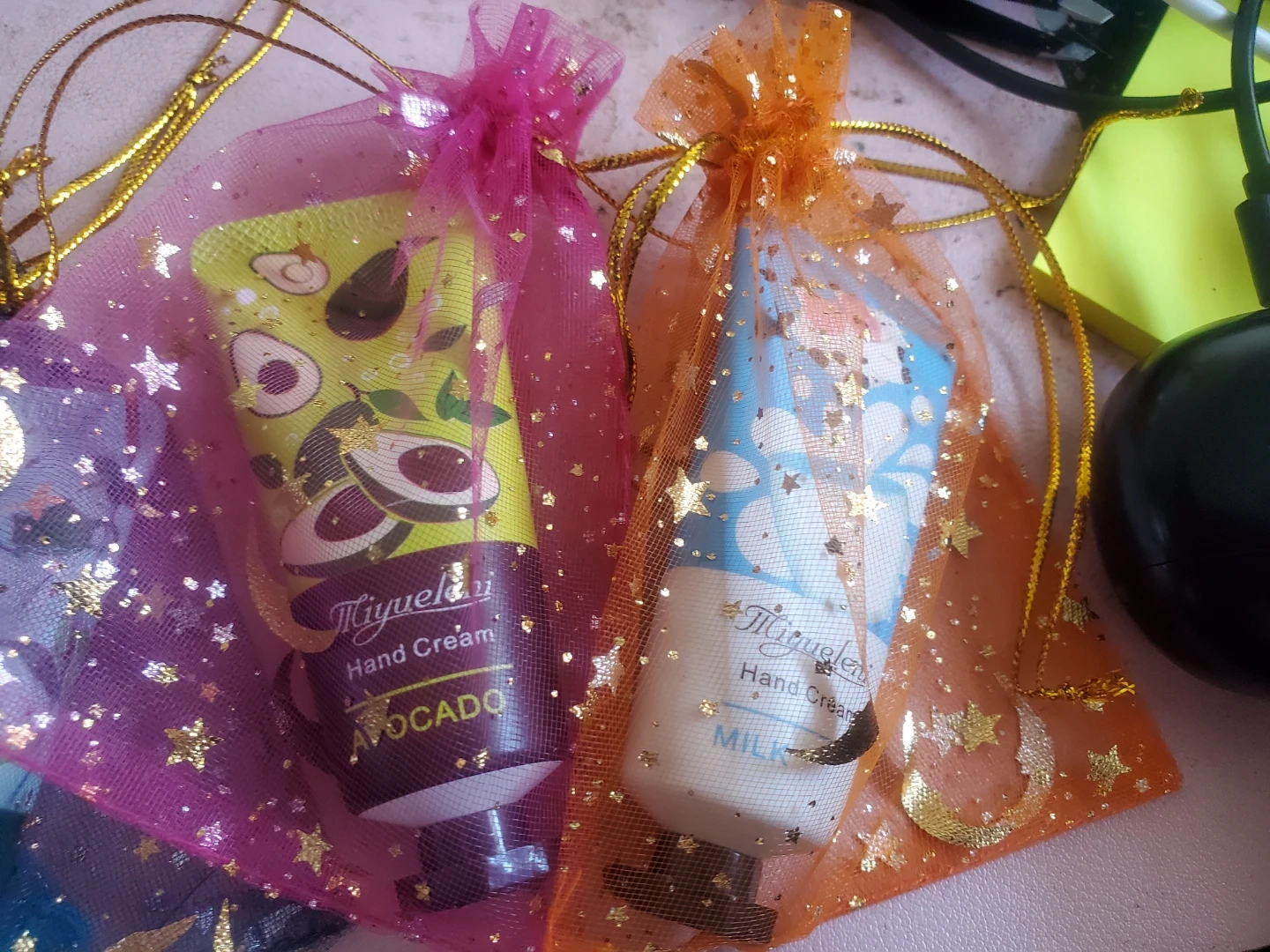 Get a set of 6 Miyueleni hand creams, each with a unique scent like Cherry Blossom, Gardenia, Green Tea, Milk, and Avocado. These little tubes are perfect for keeping your hands moisturized on the go. They come in cute, sheer organza bags, making them great for small gifts or party favours!