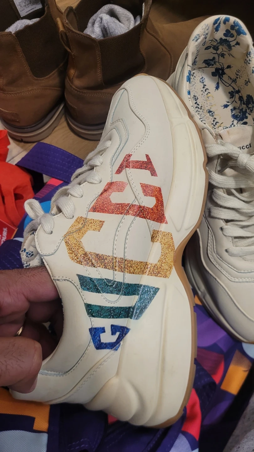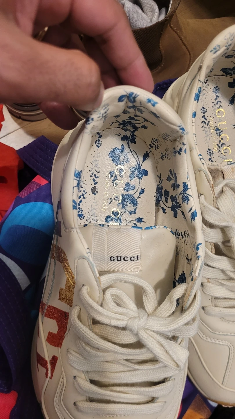 Selling a pair of Gucci sneakers. They have a colourful design on the side and a floral pattern inside. They are in good condition!