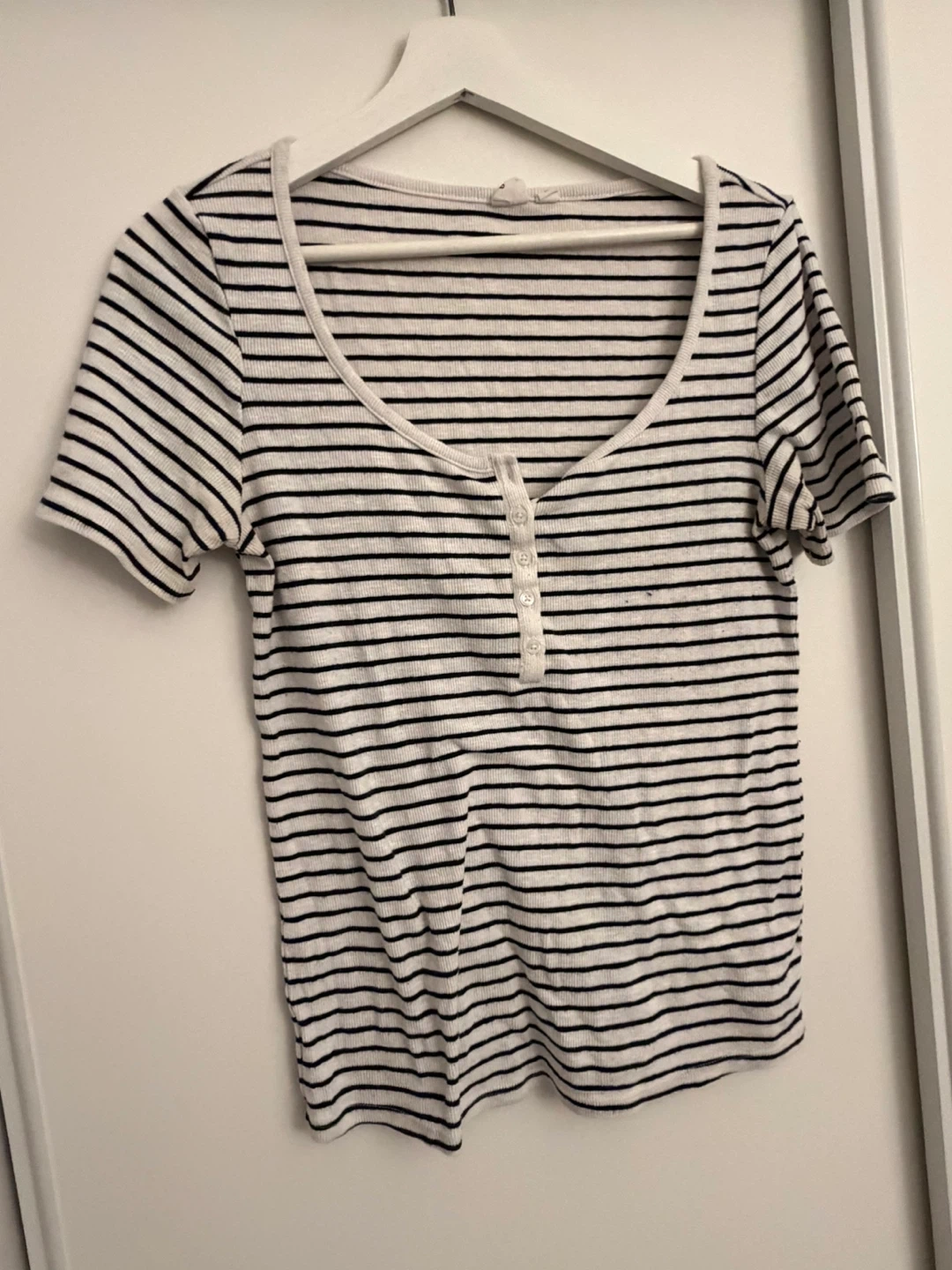 This is a classic striped t-shirt with a Henley neckline and button detailing. It's made from a comfortable ribbed knit fabric. The horizontal stripes are black and white. This top is great for casual everyday wear.