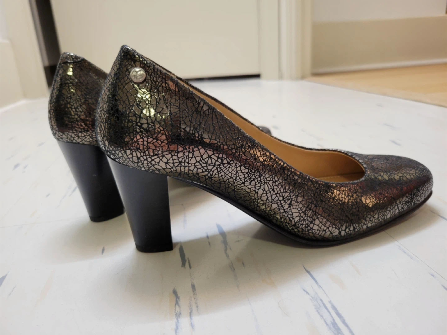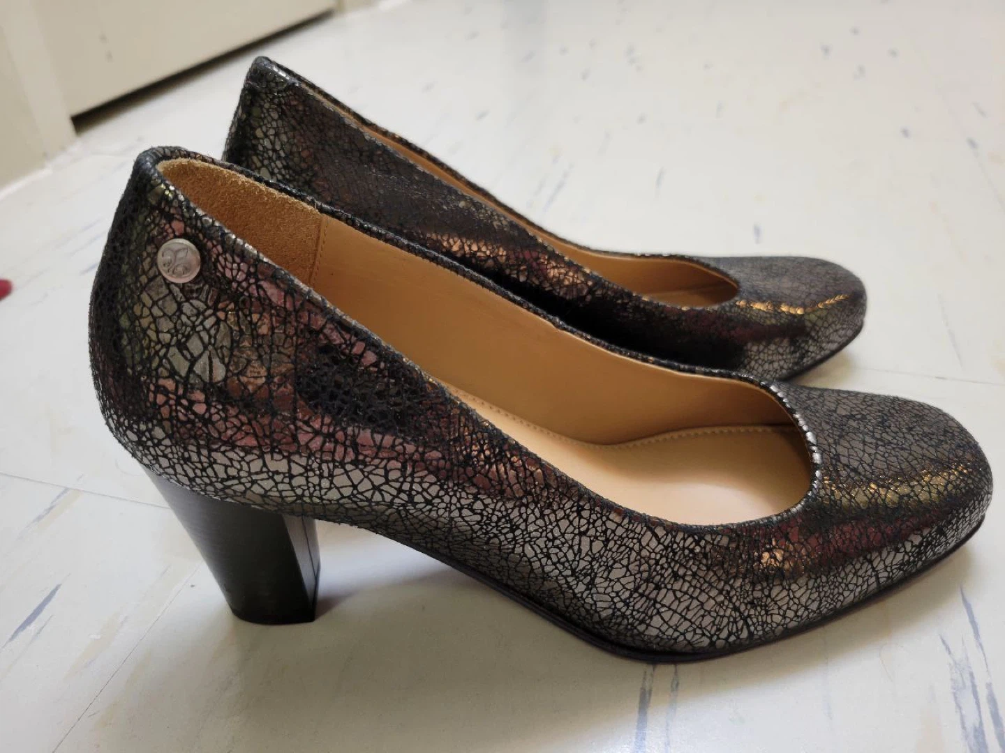 These Jolie women's heels feature a stylish crackle print design.They have a comfortable orthotic sole for all-day wear. The block heel provides a stable and fashionable lift.